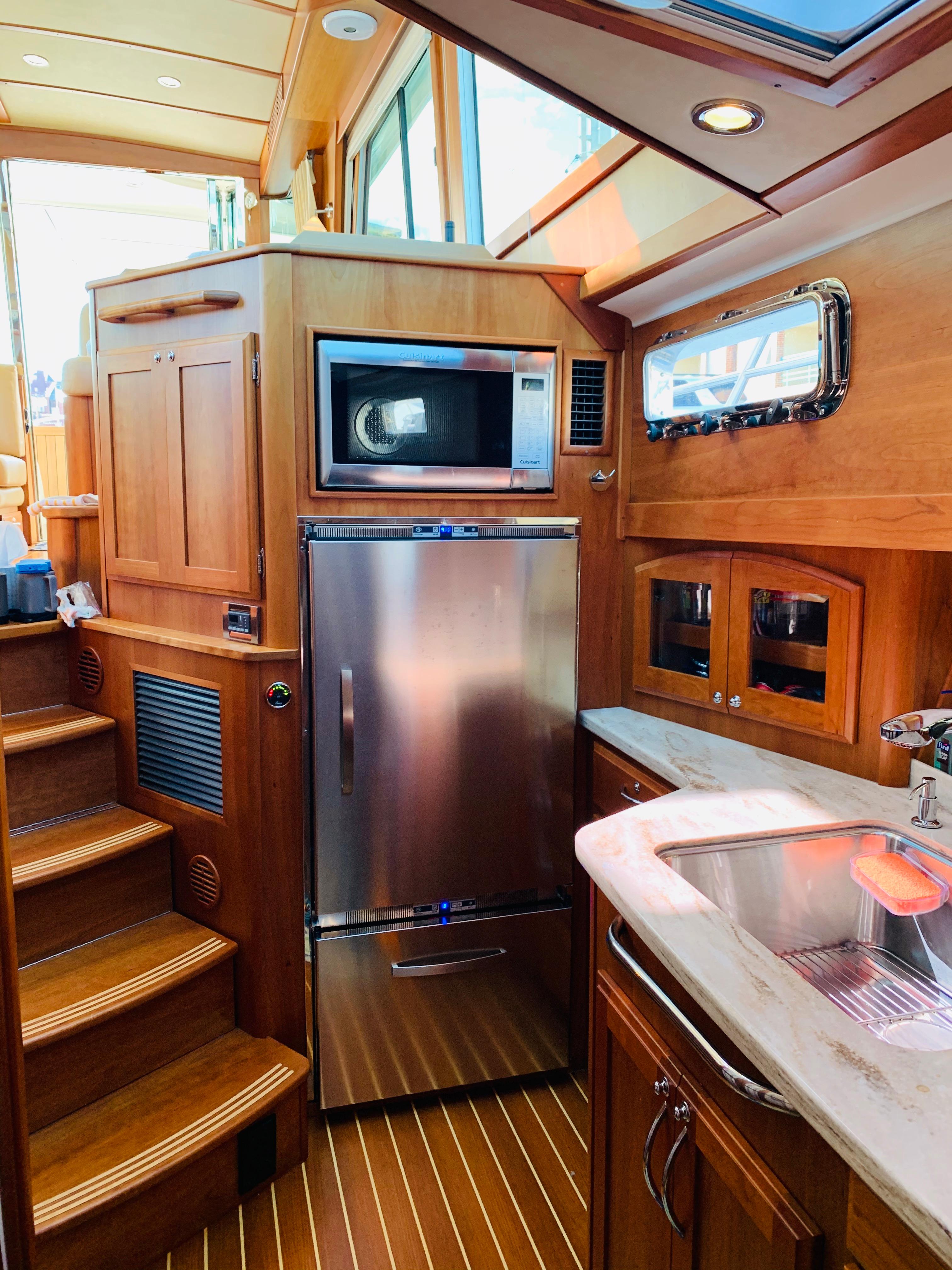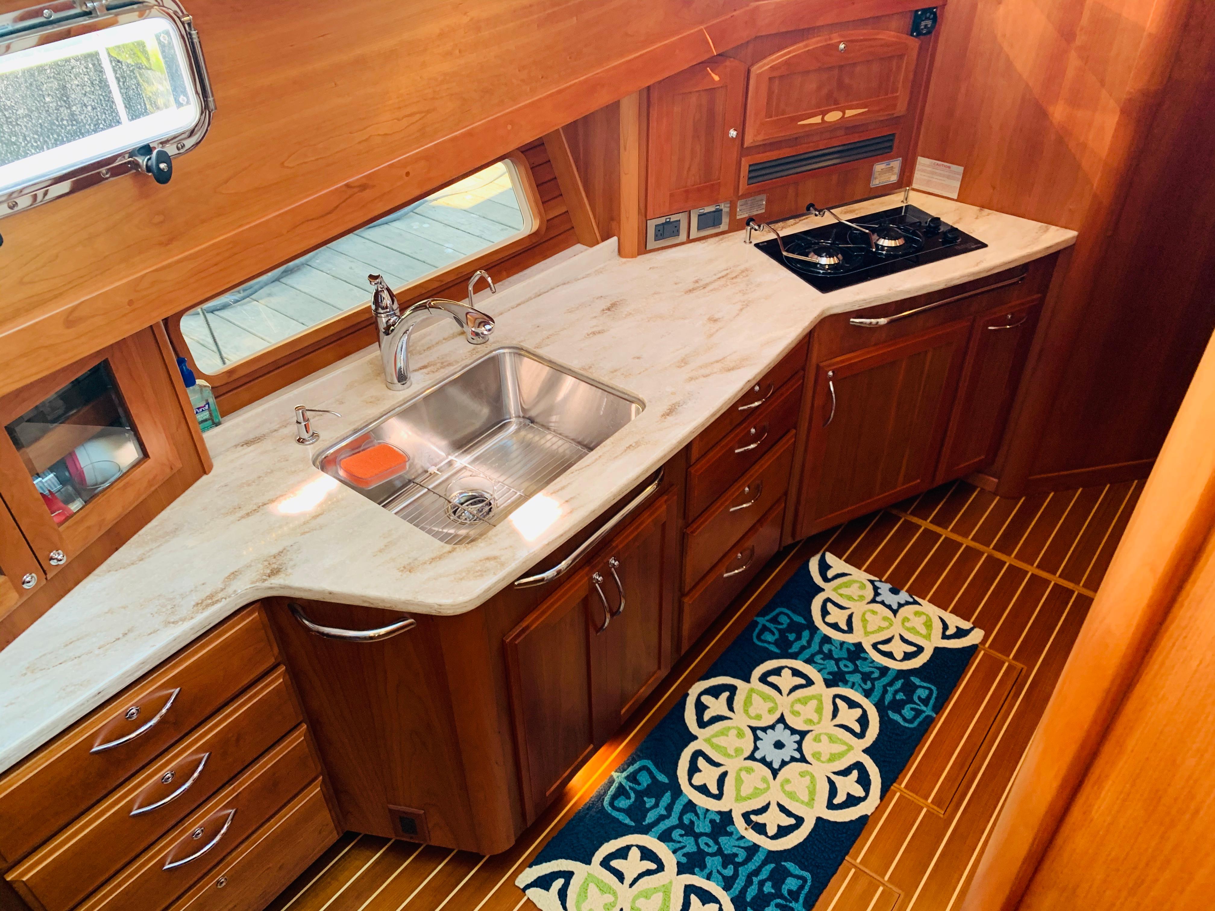 • Add a door on the small cabinet forward of galley sink. Remove fiddle and leave open inside