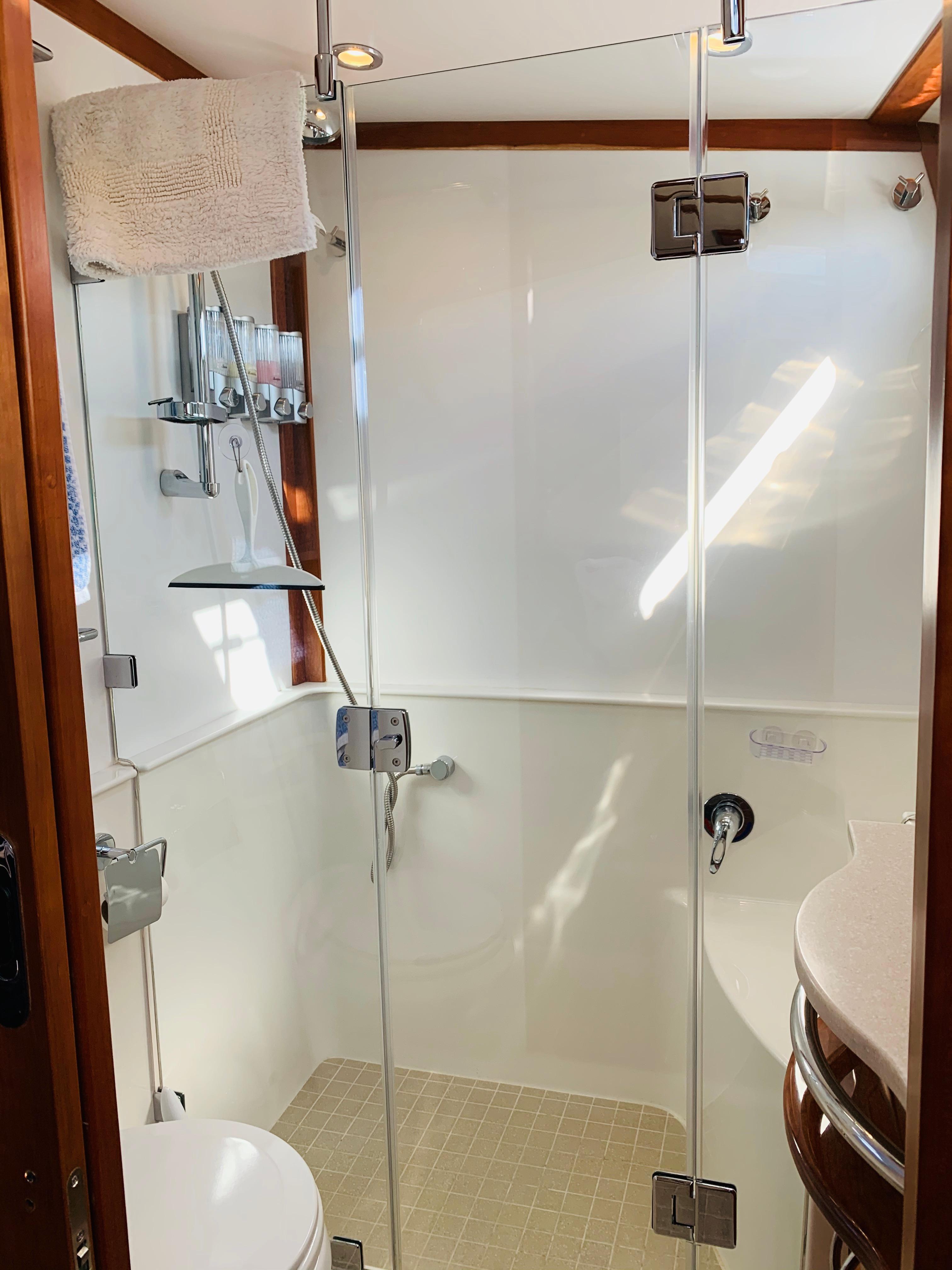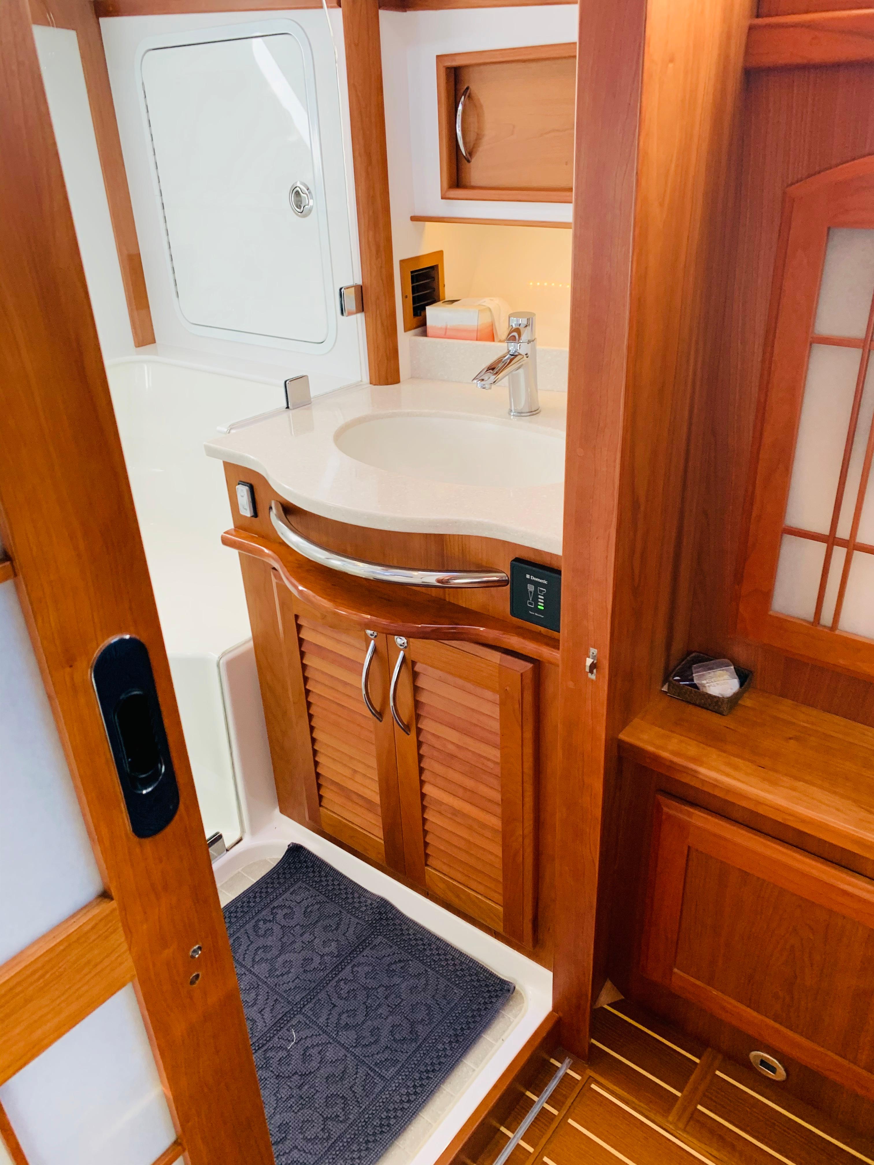 Featuring a master stateroom midship with private head, guest quarters forward, and full crew quarters can be found below the salon. The crew quarters features a queen birth with TV, washer & dryer combo unit, and an enclosed head.