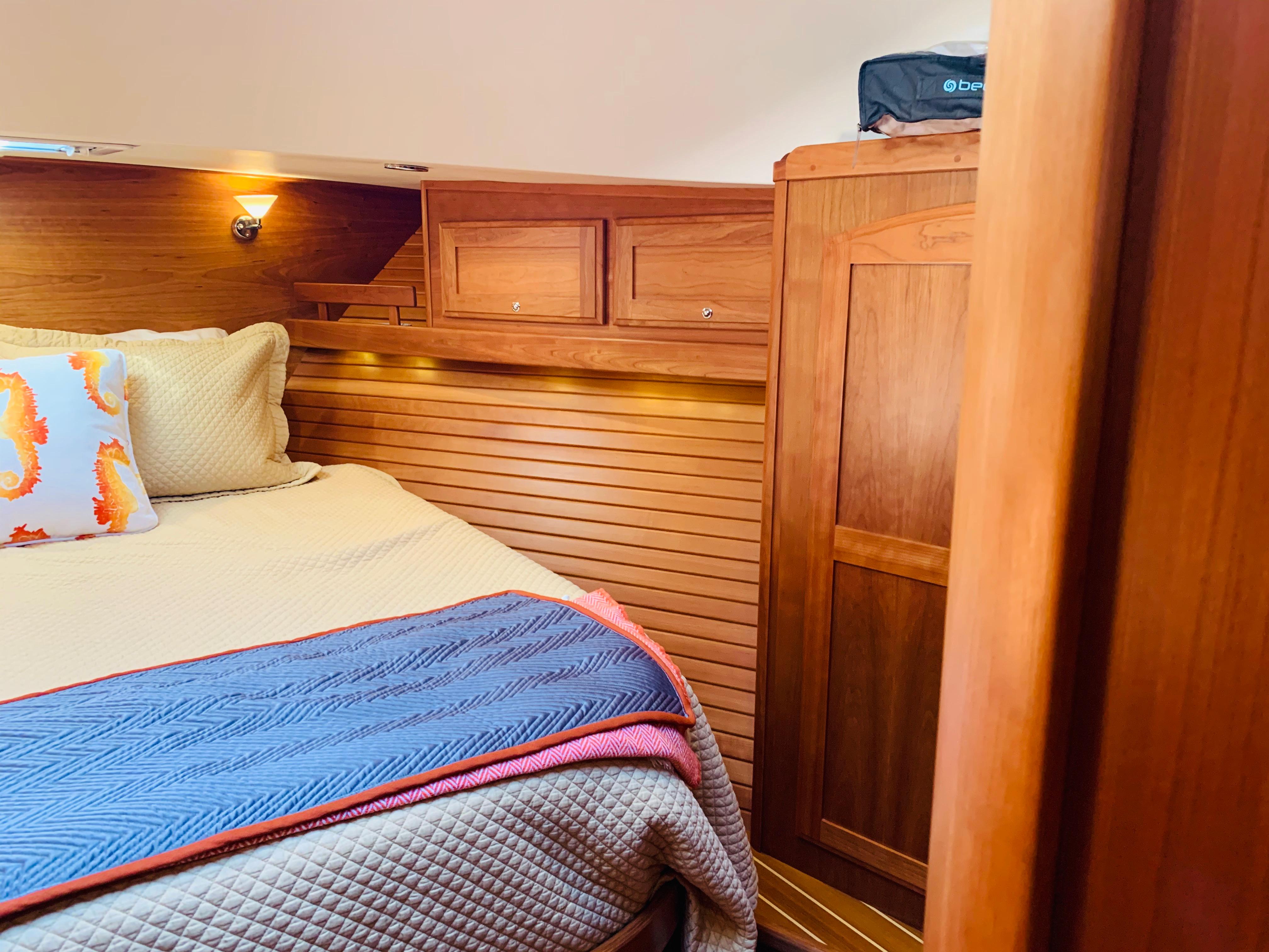 • Install 12V/USB charger centers at head of master berth, both sides of shelf