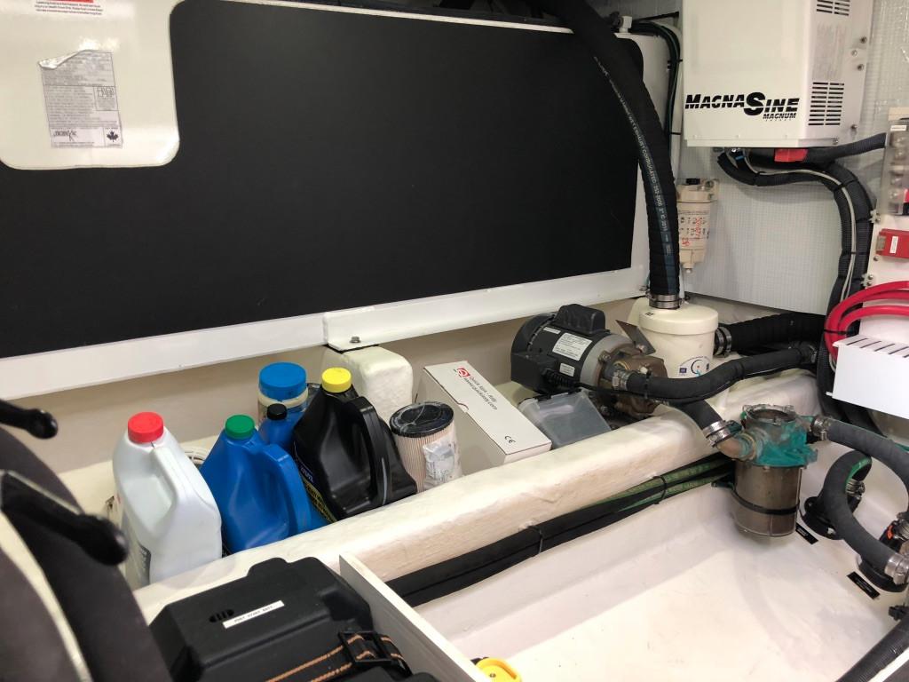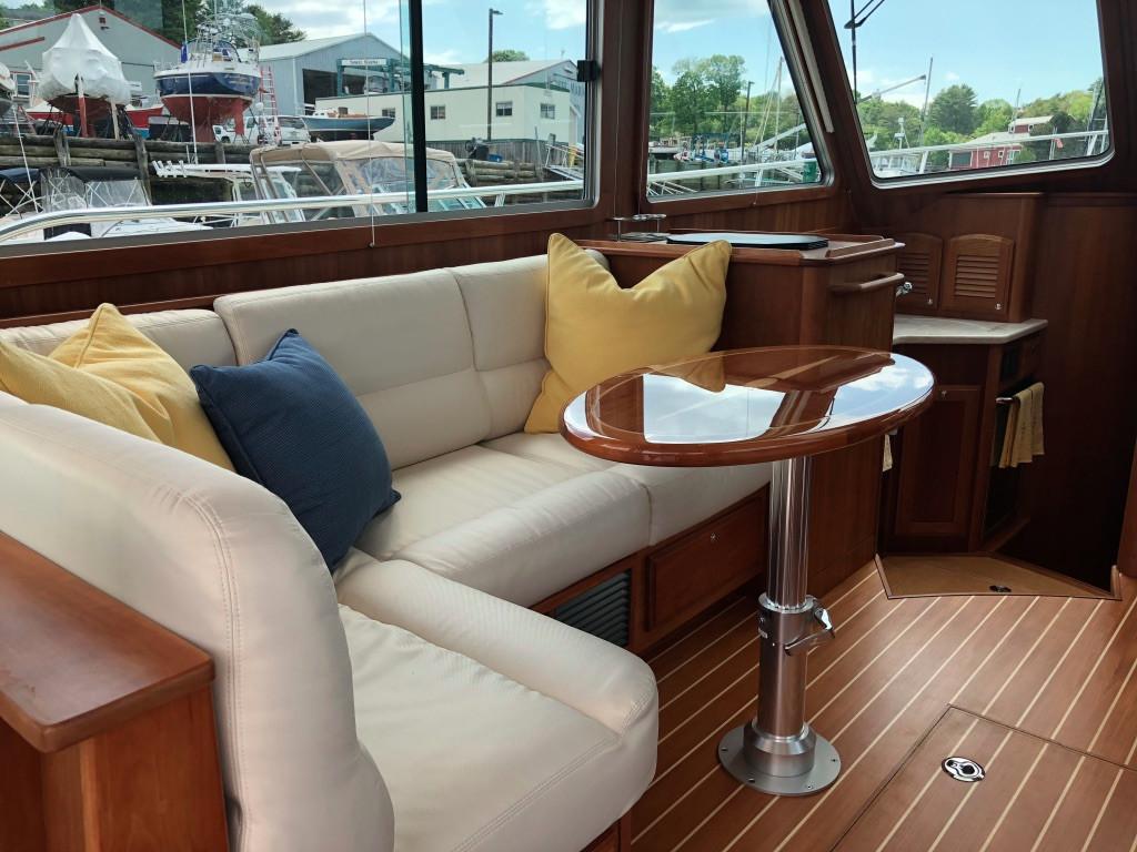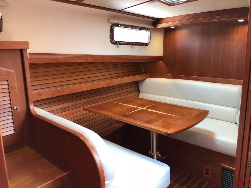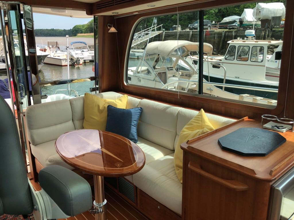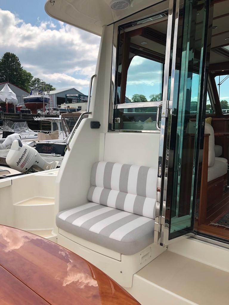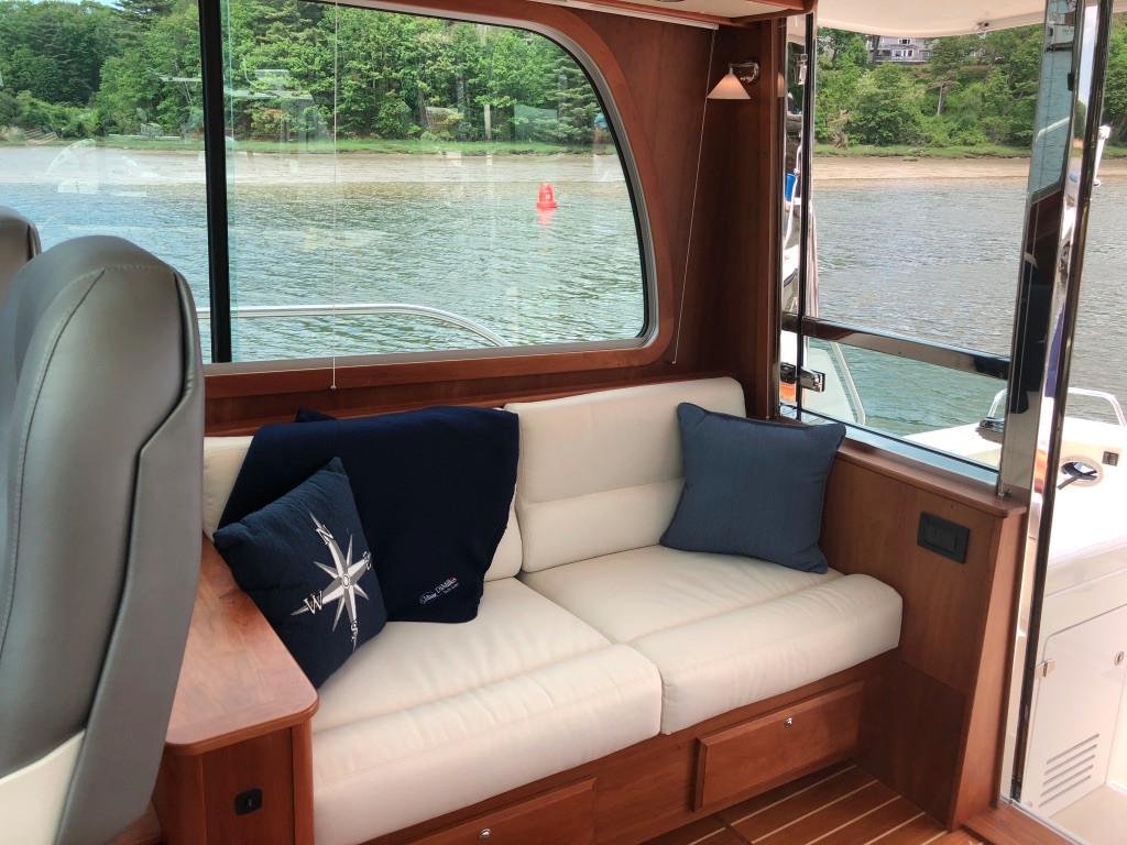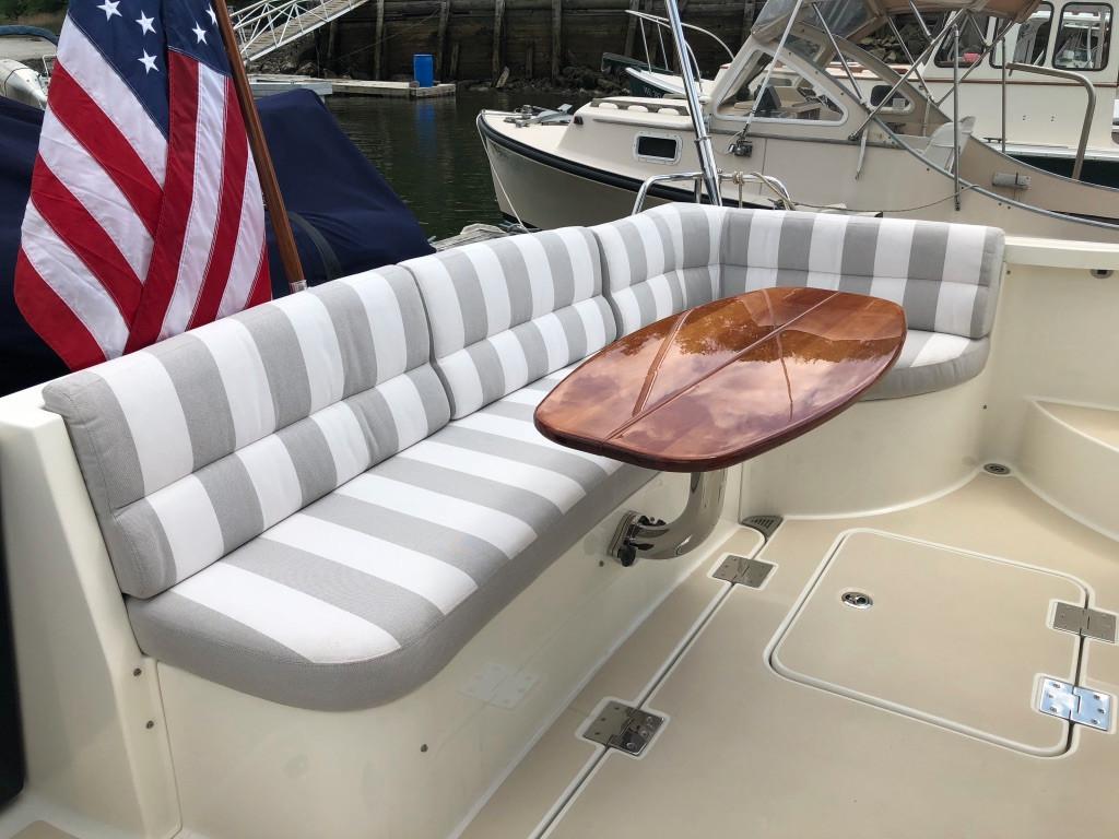 “L” settee to port, 5” foam cushions, with storage and Sabre tool drawer under. Sunbrella fabric seat coverings