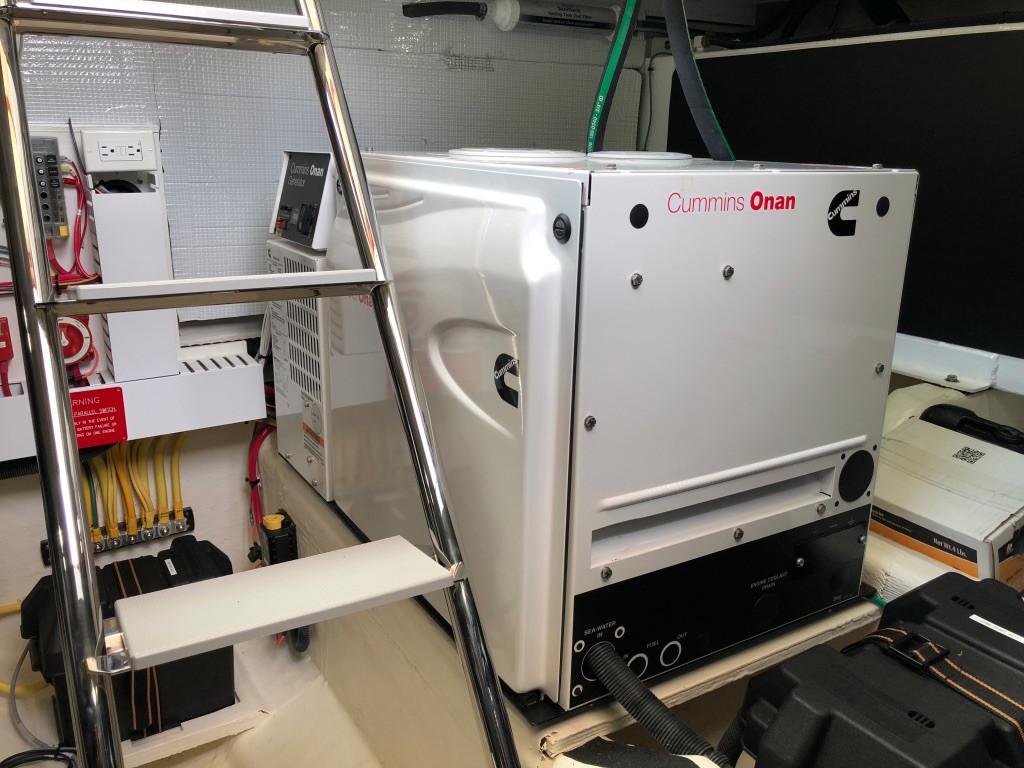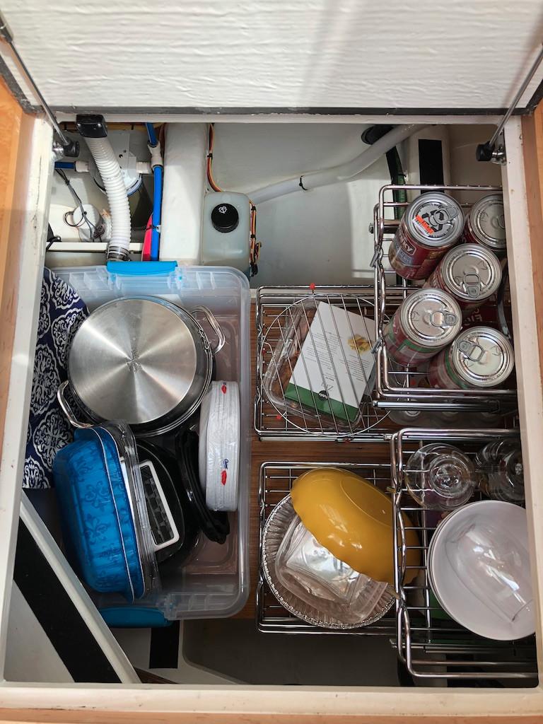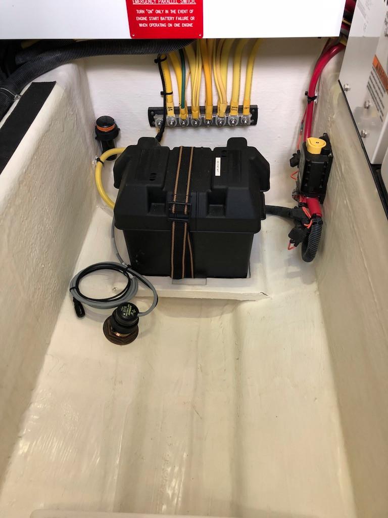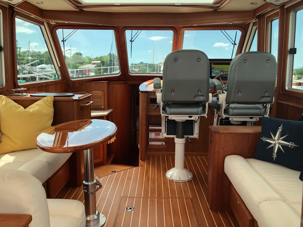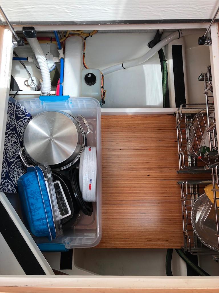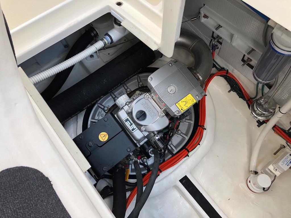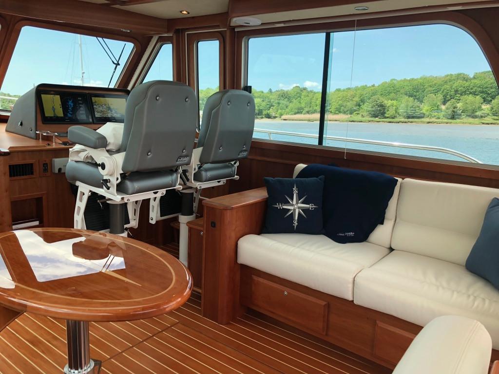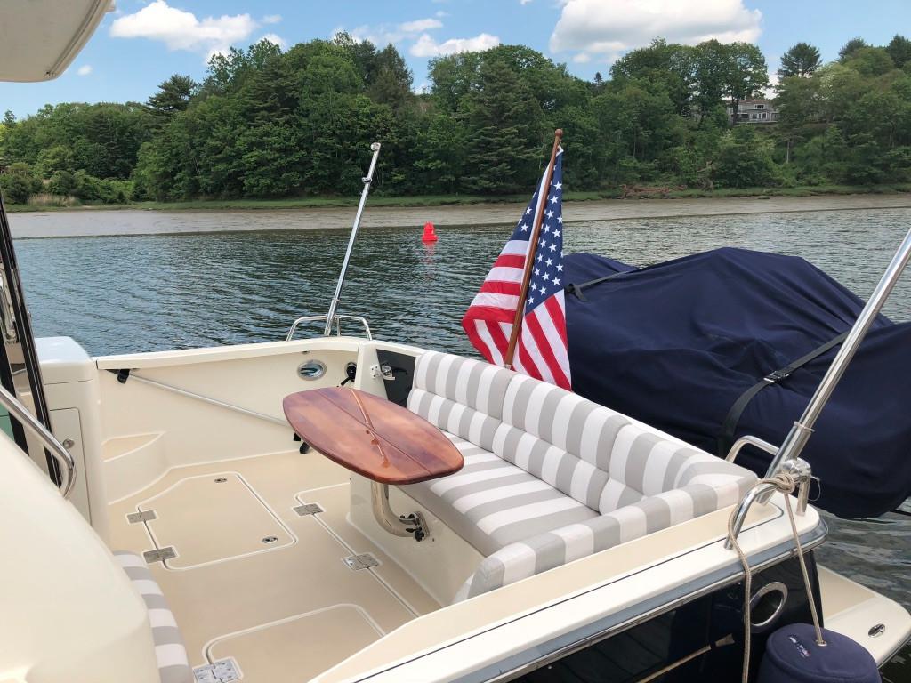 “L” settee to port, 5” foam cushions, with storage and Sabre tool drawer under. Sunbrella fabric seat coverings