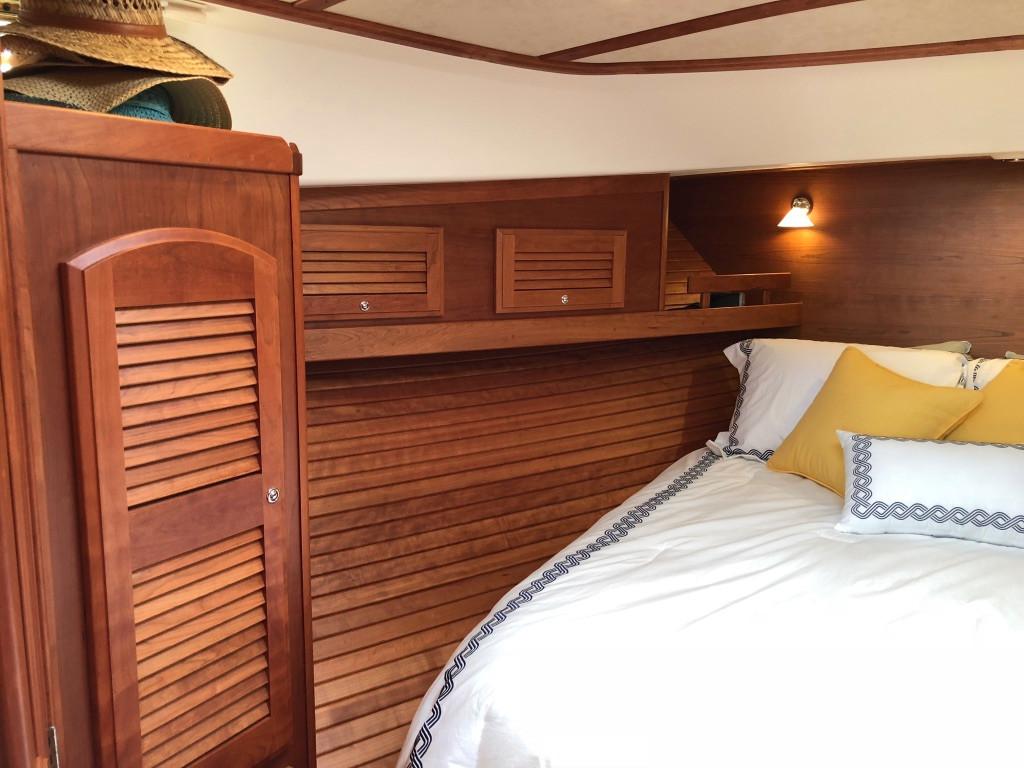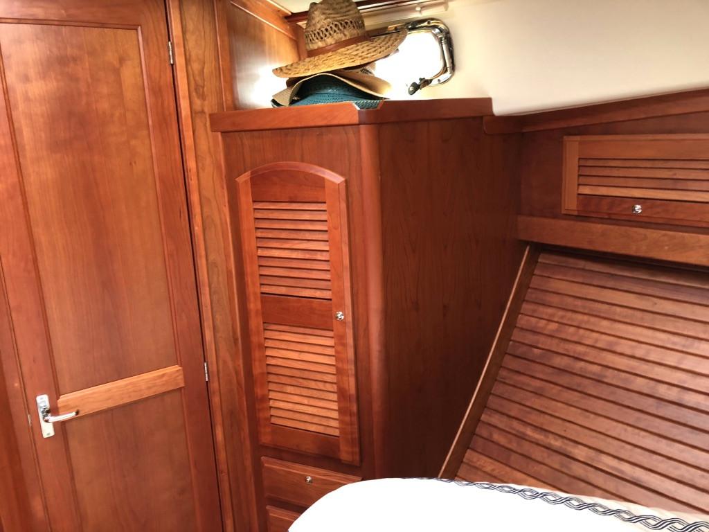 Large cedar lined hanging locker to port, with louvered door, cedar shelf and hangar pole