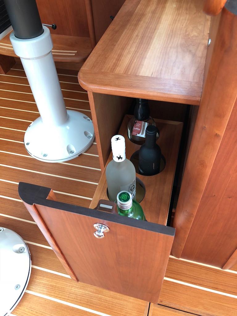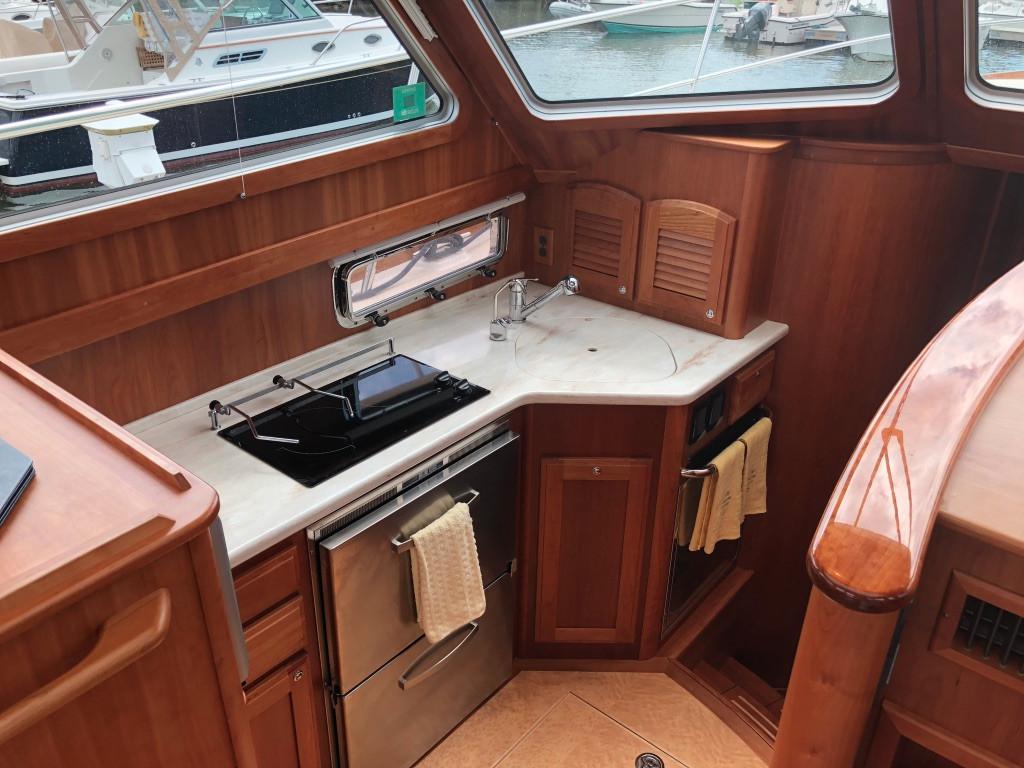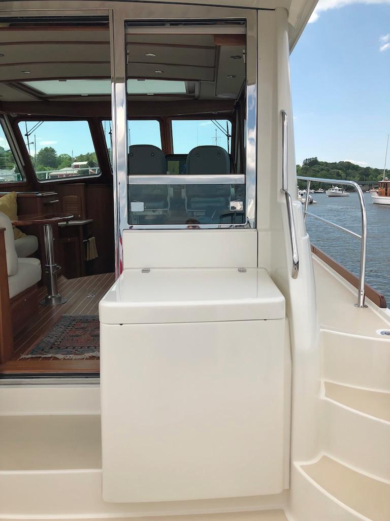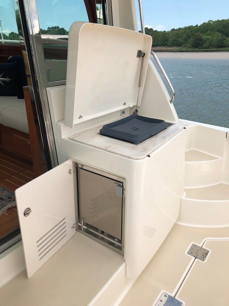Fiberglass cabinet in starboard side of cockpit includes electric grille with hinged top and ice maker. Countertop Witch Hazel Corian