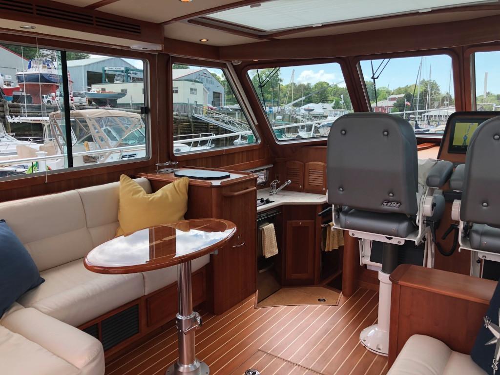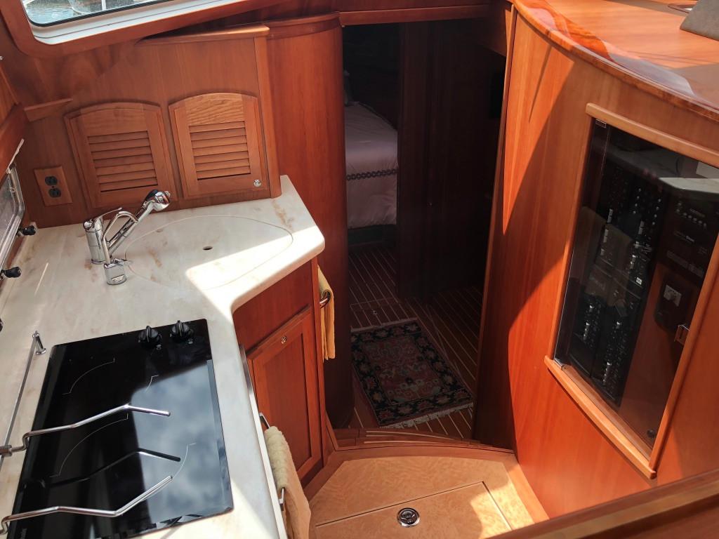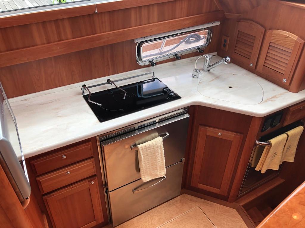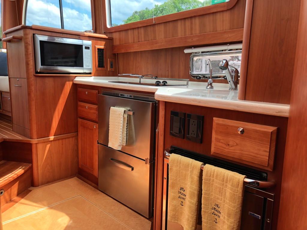 Fiberglass cabinet in starboard side of cockpit includes electric grille with hinged top and ice maker. Countertop Witch Hazel Corian
