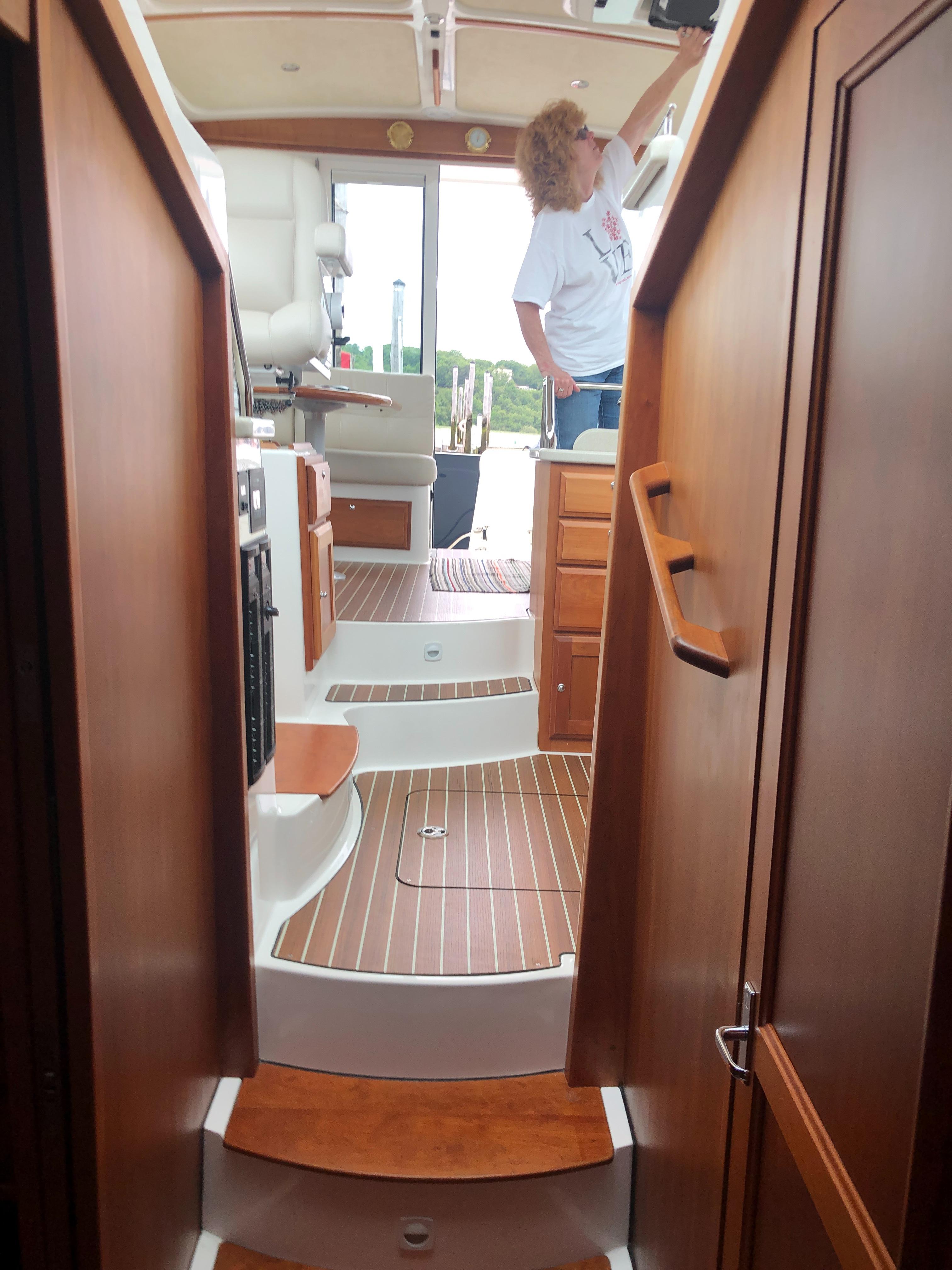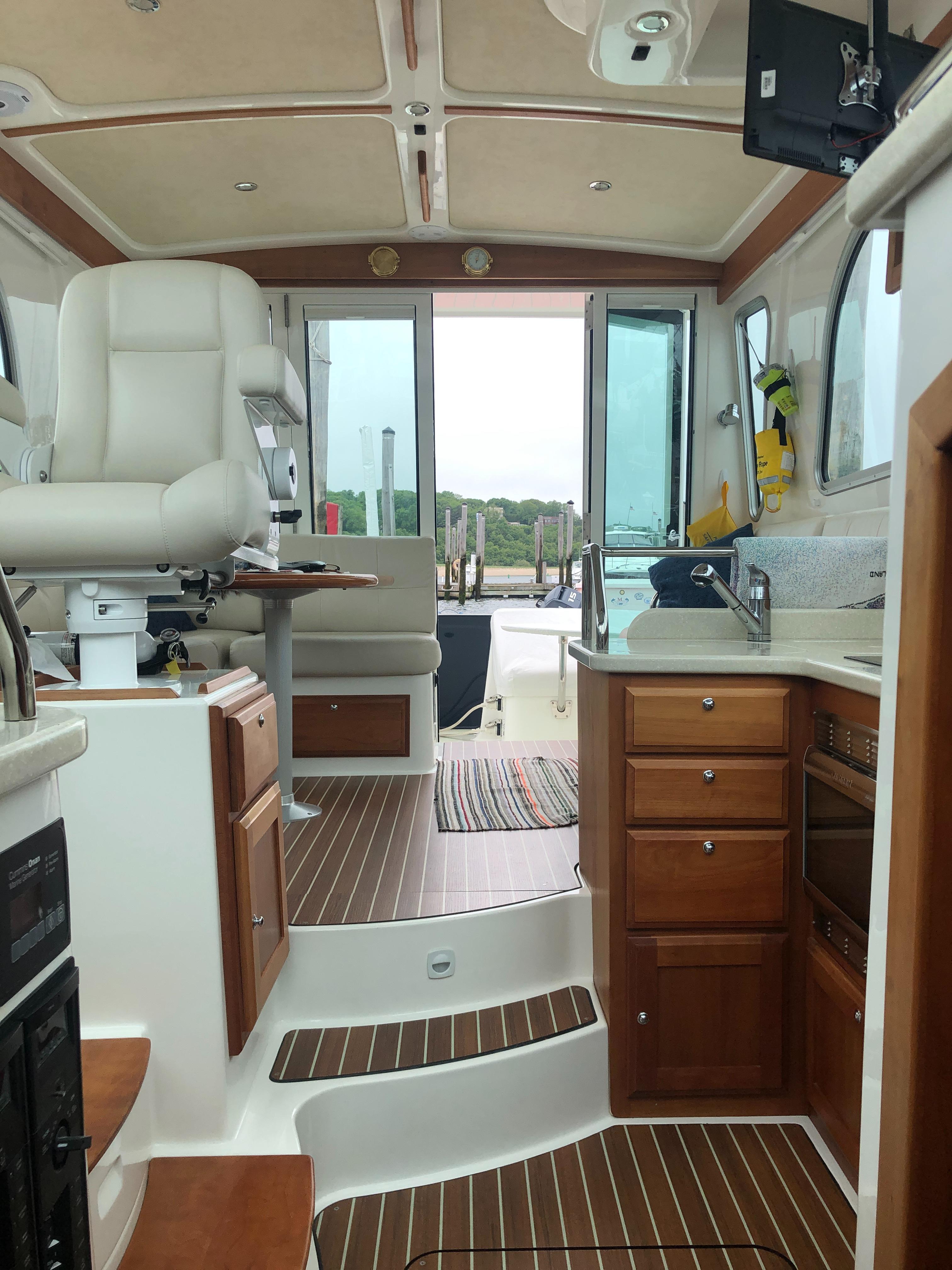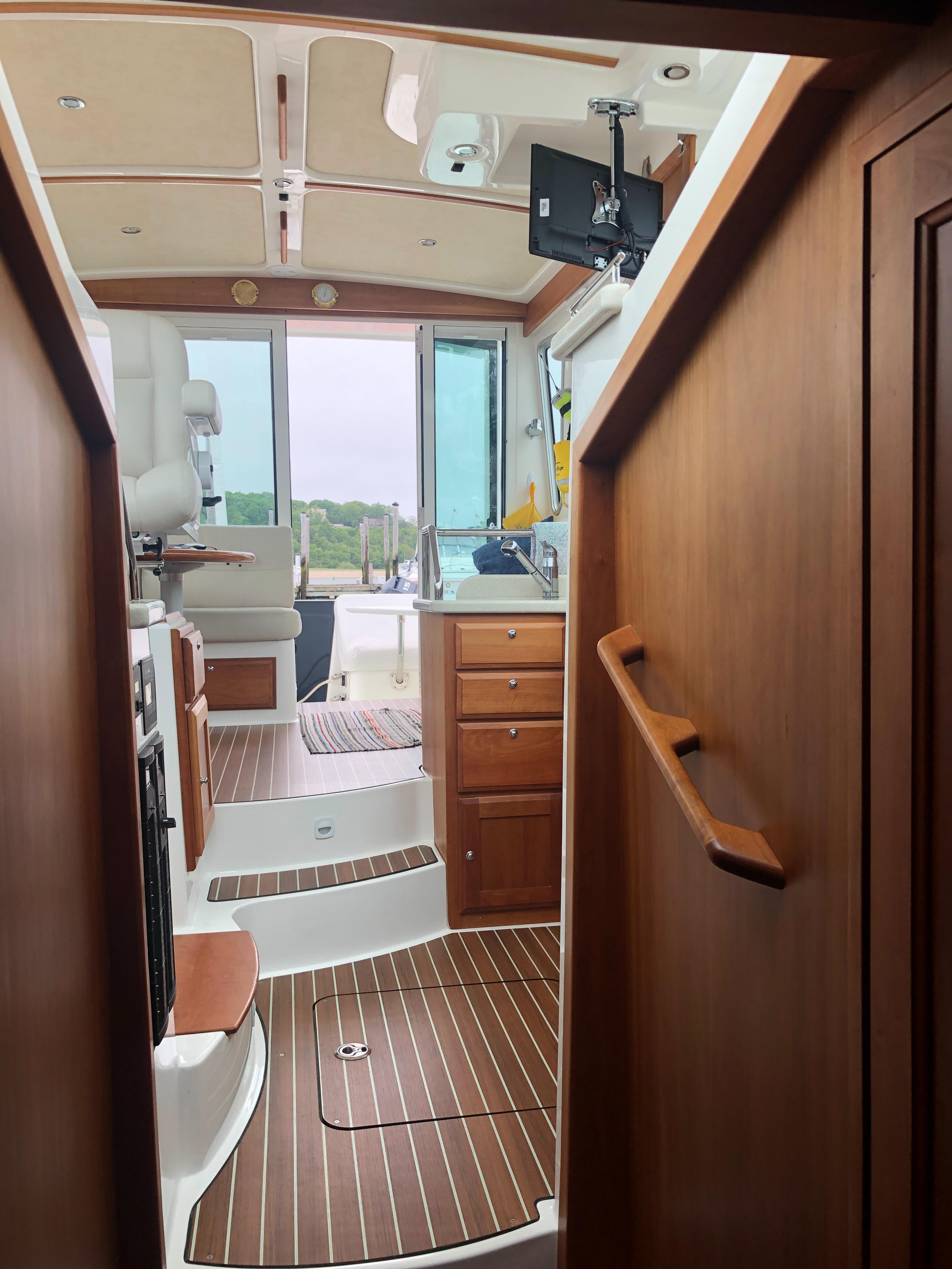 Varnished Cherry interior joinery on molded composite hull liner