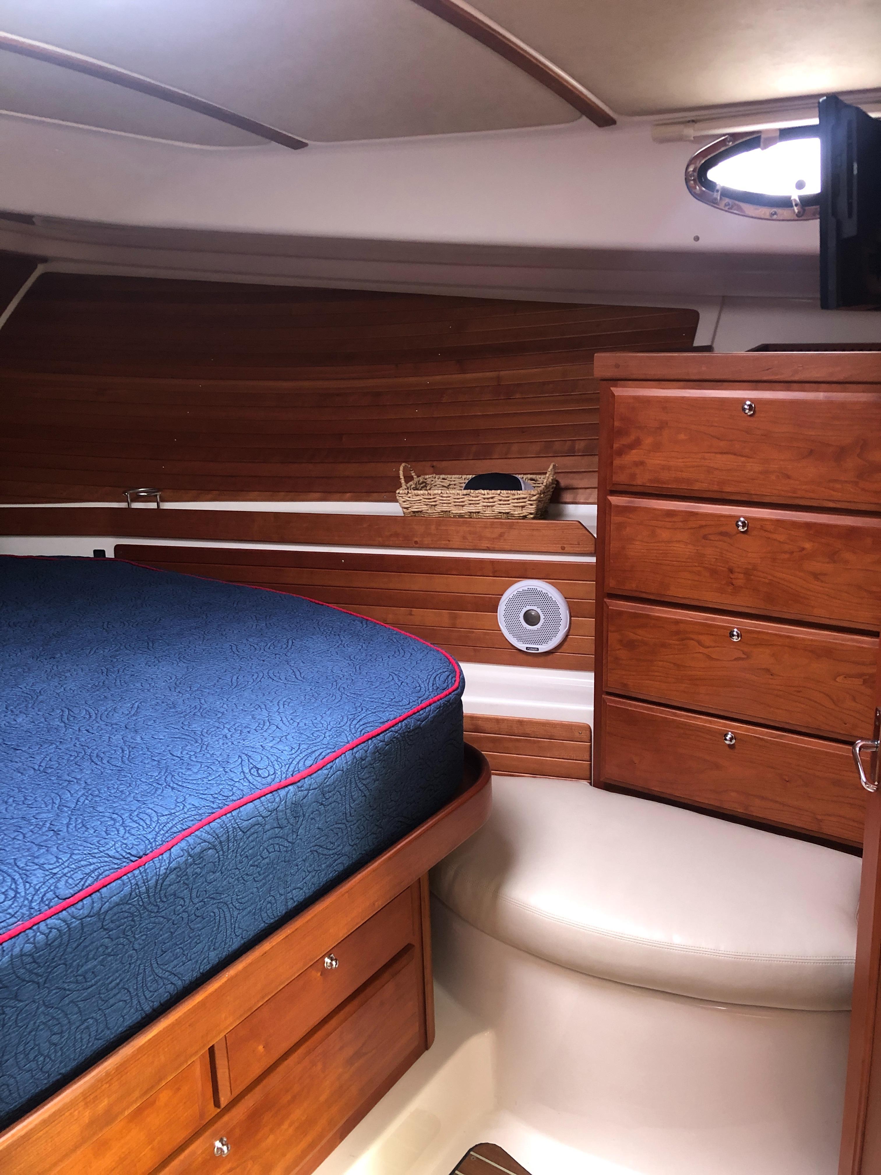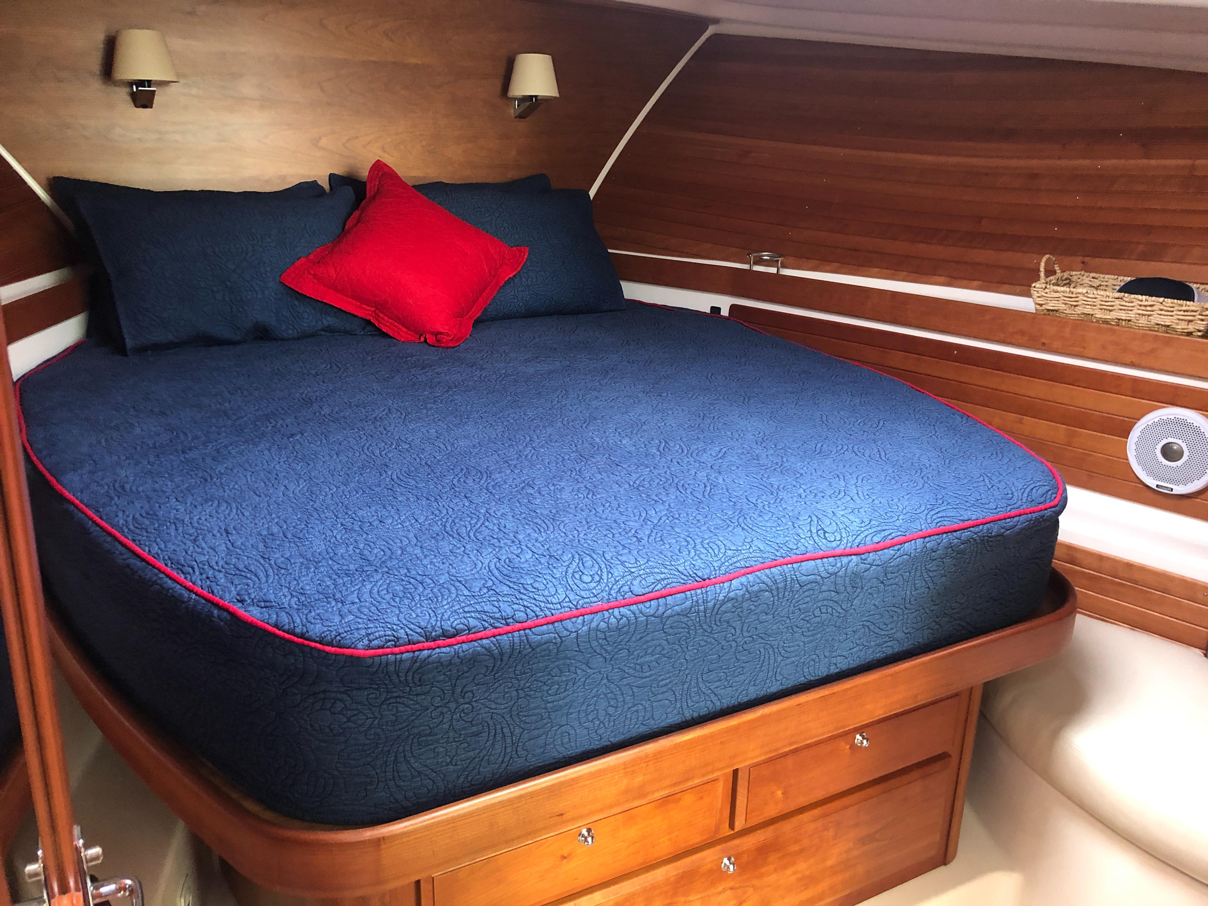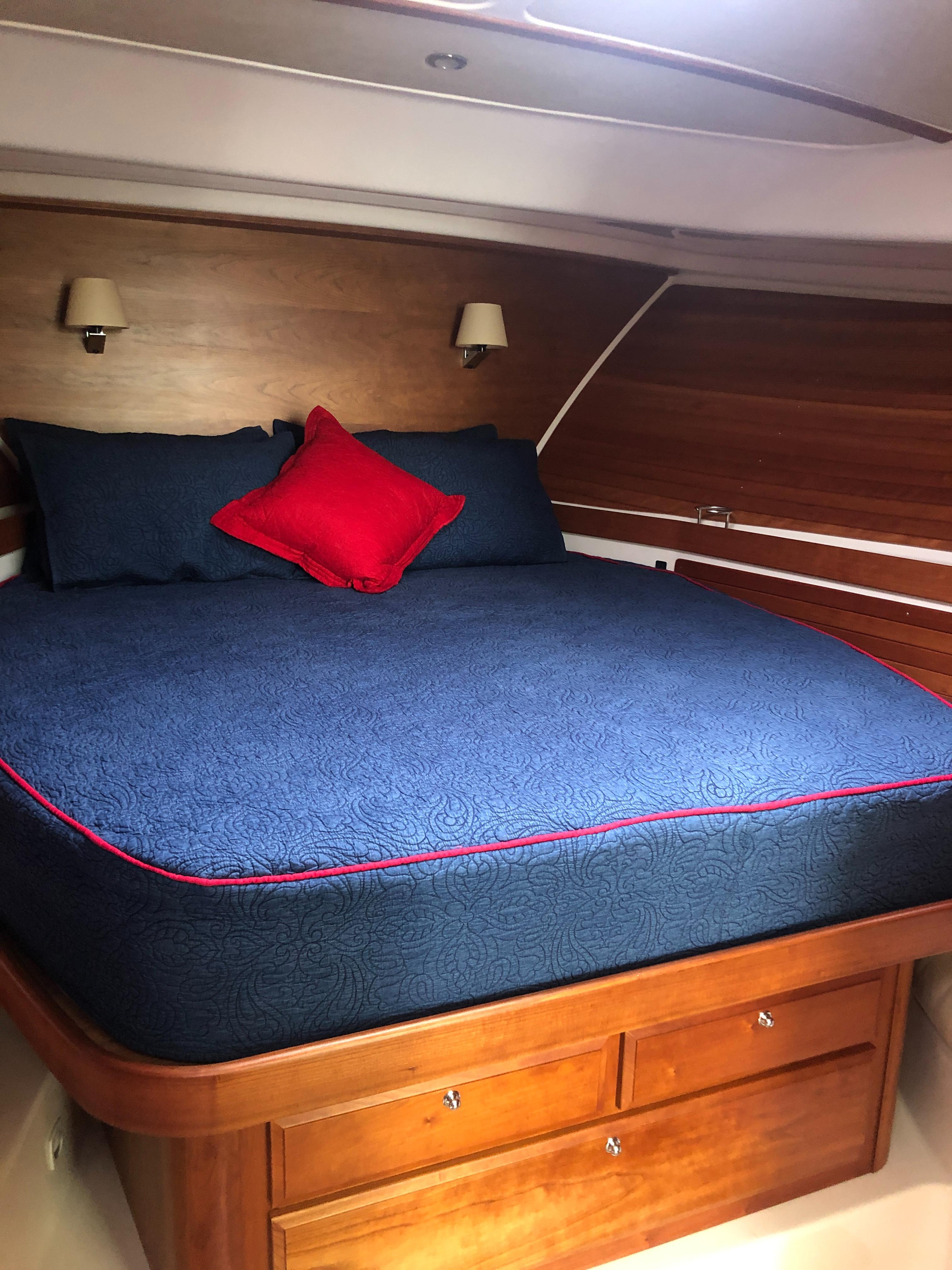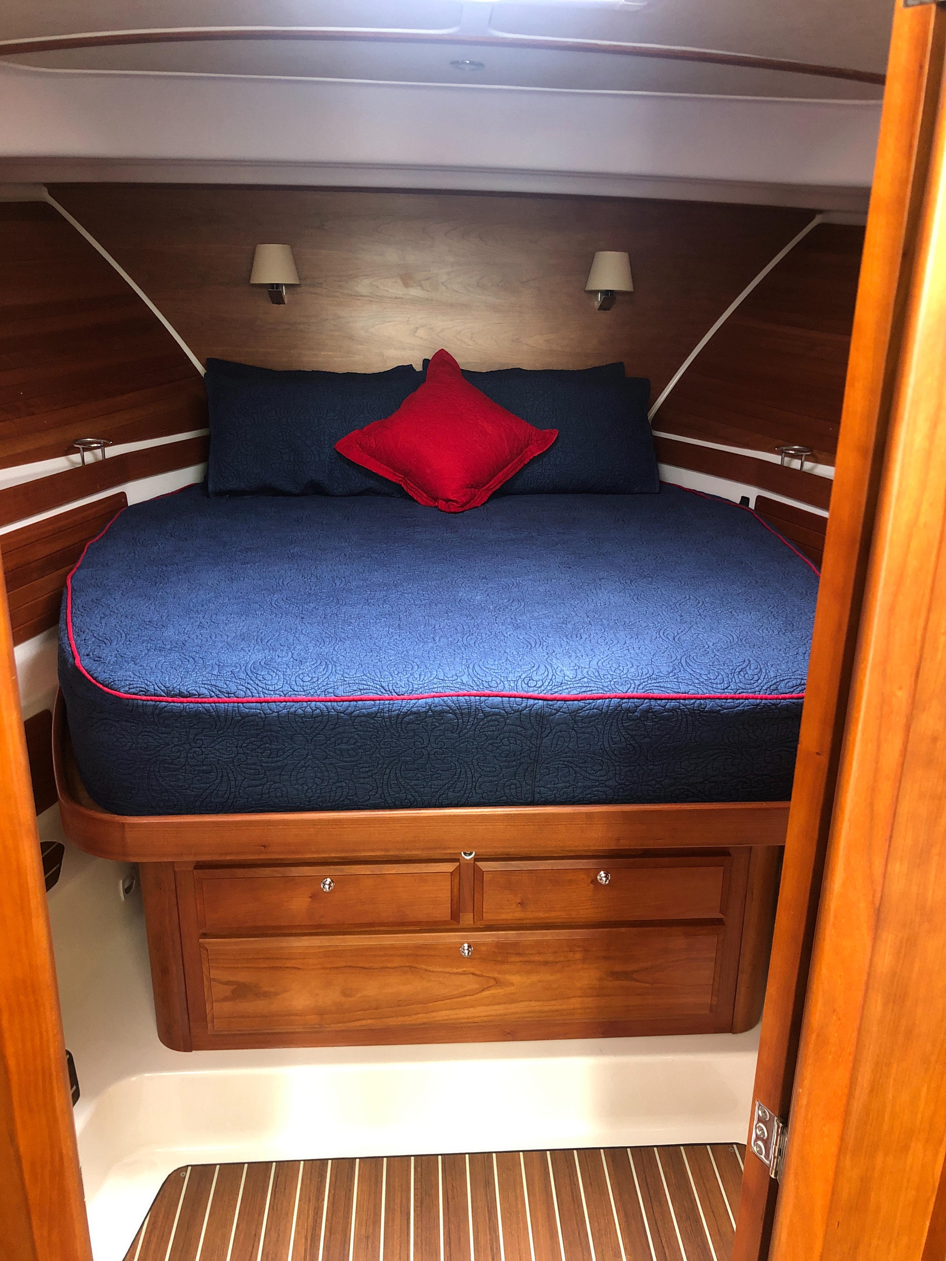 Island queen berth w/ drawers and storage below