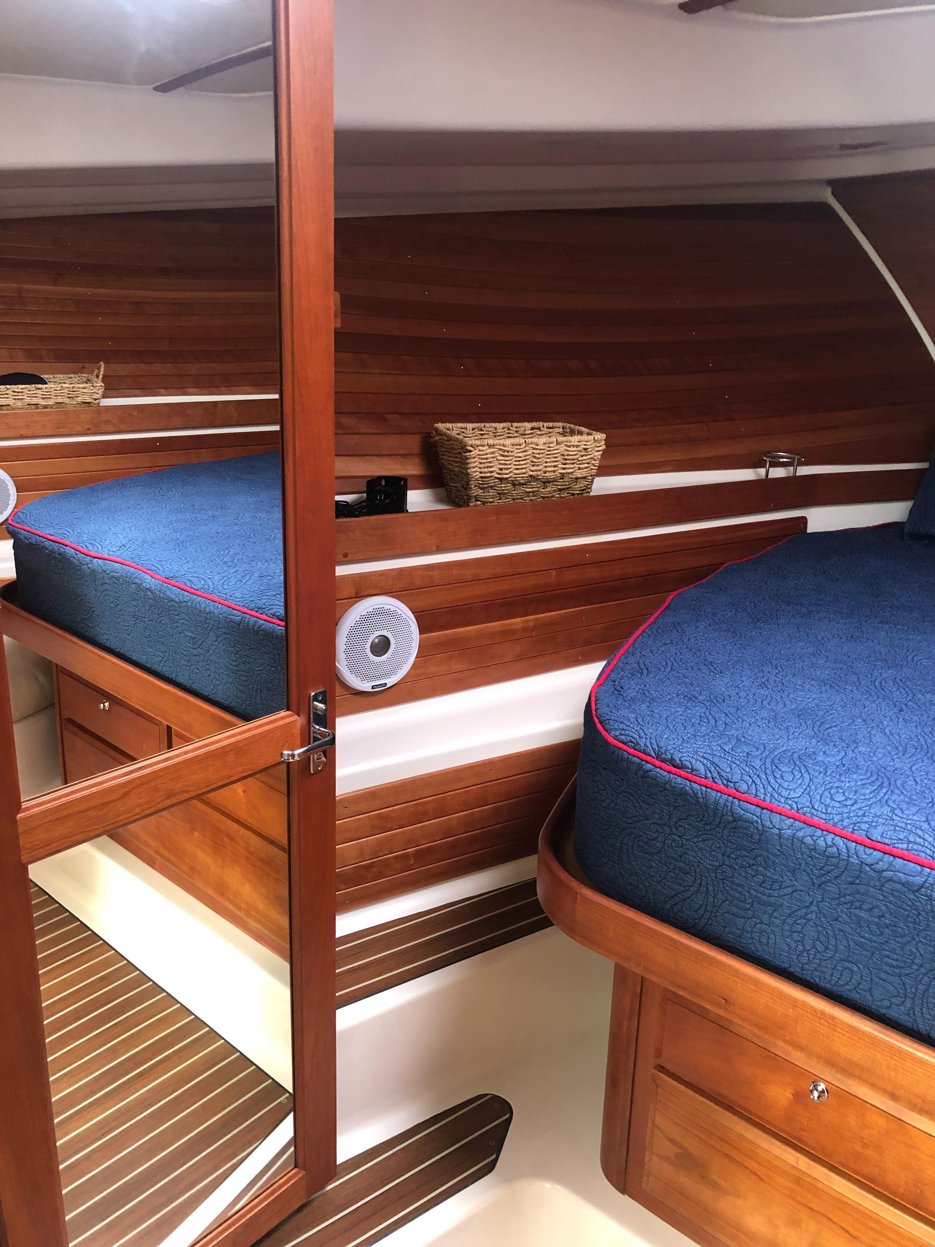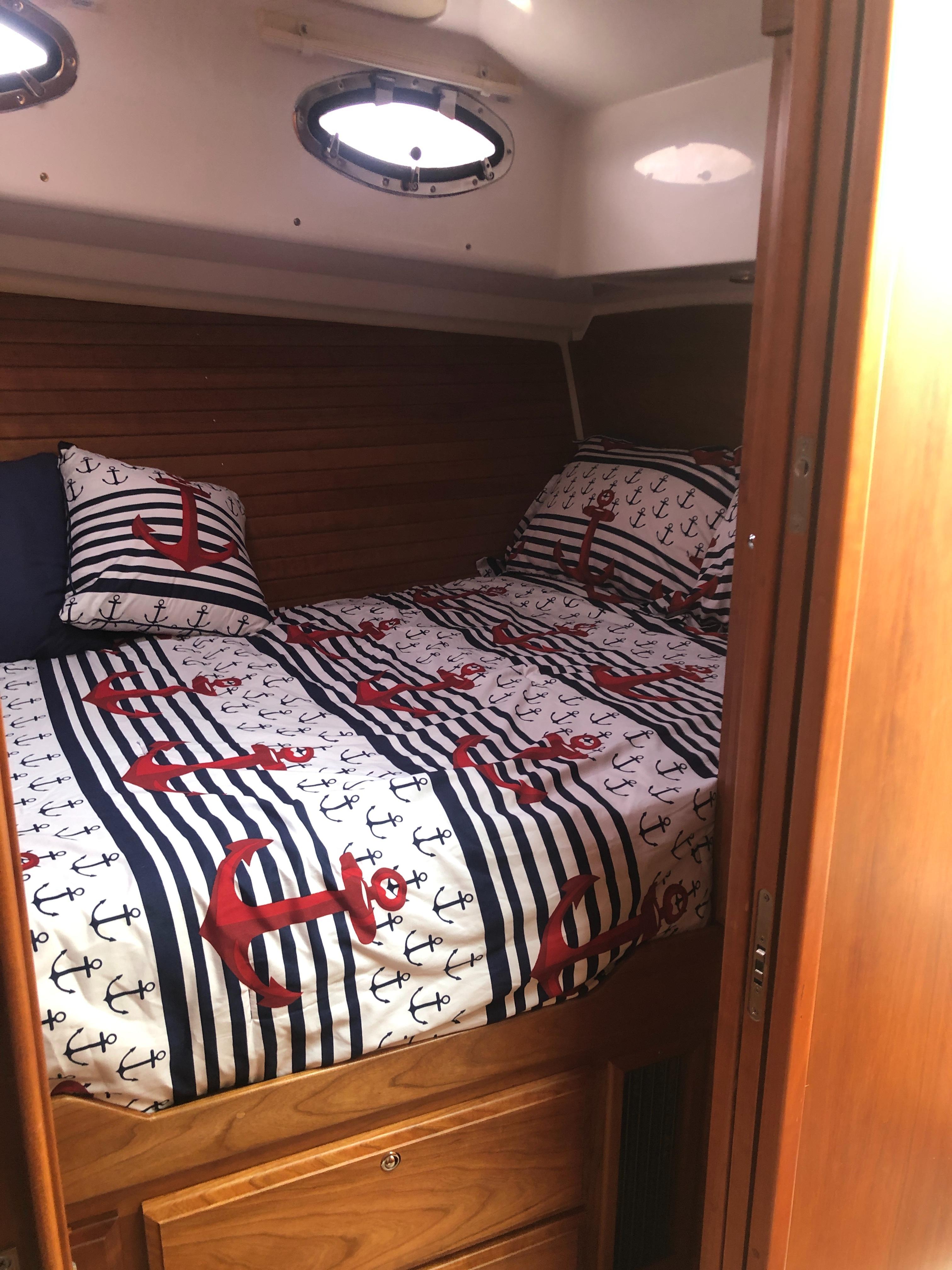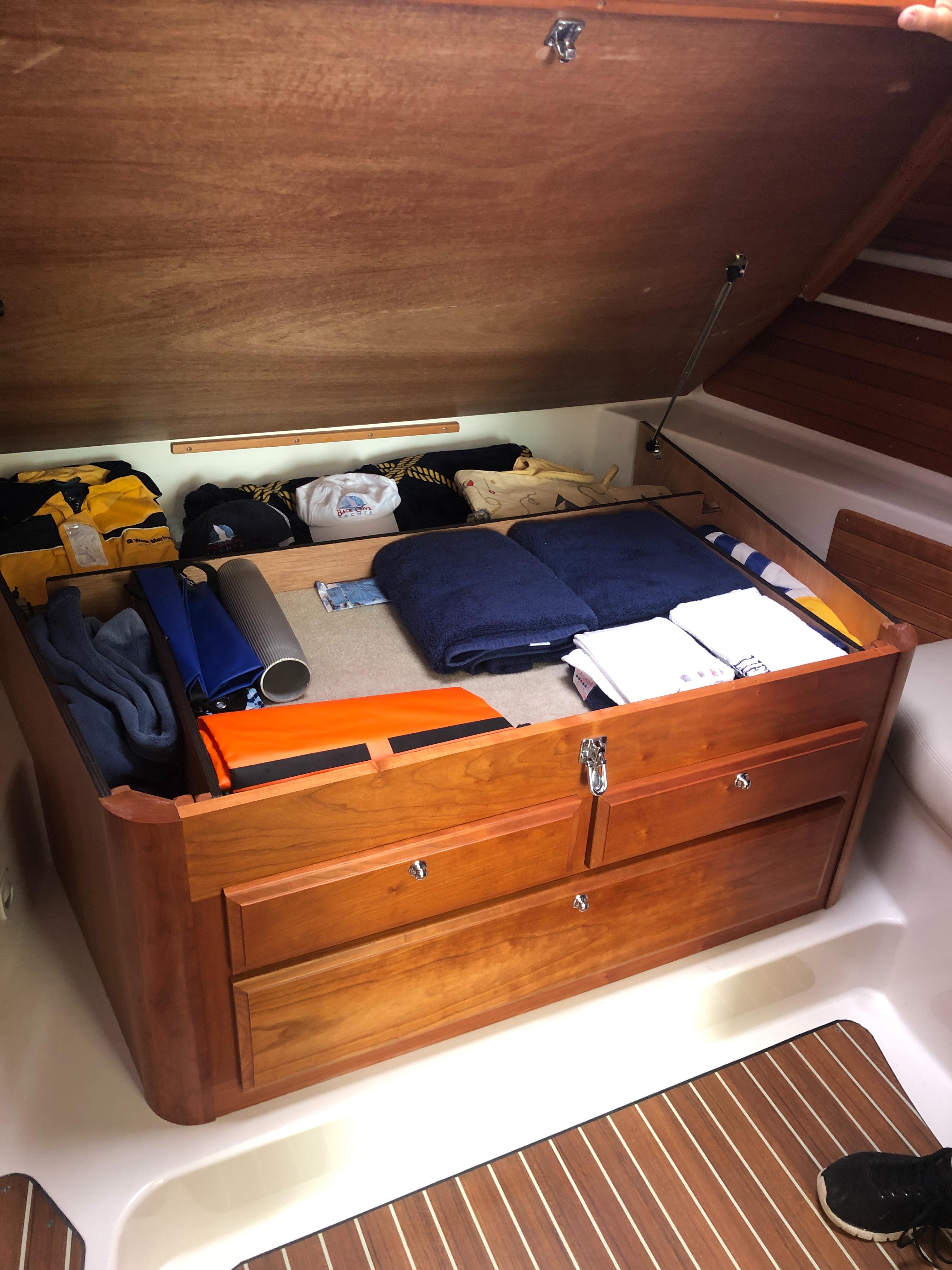 Island queen berth w/ drawers and storage below