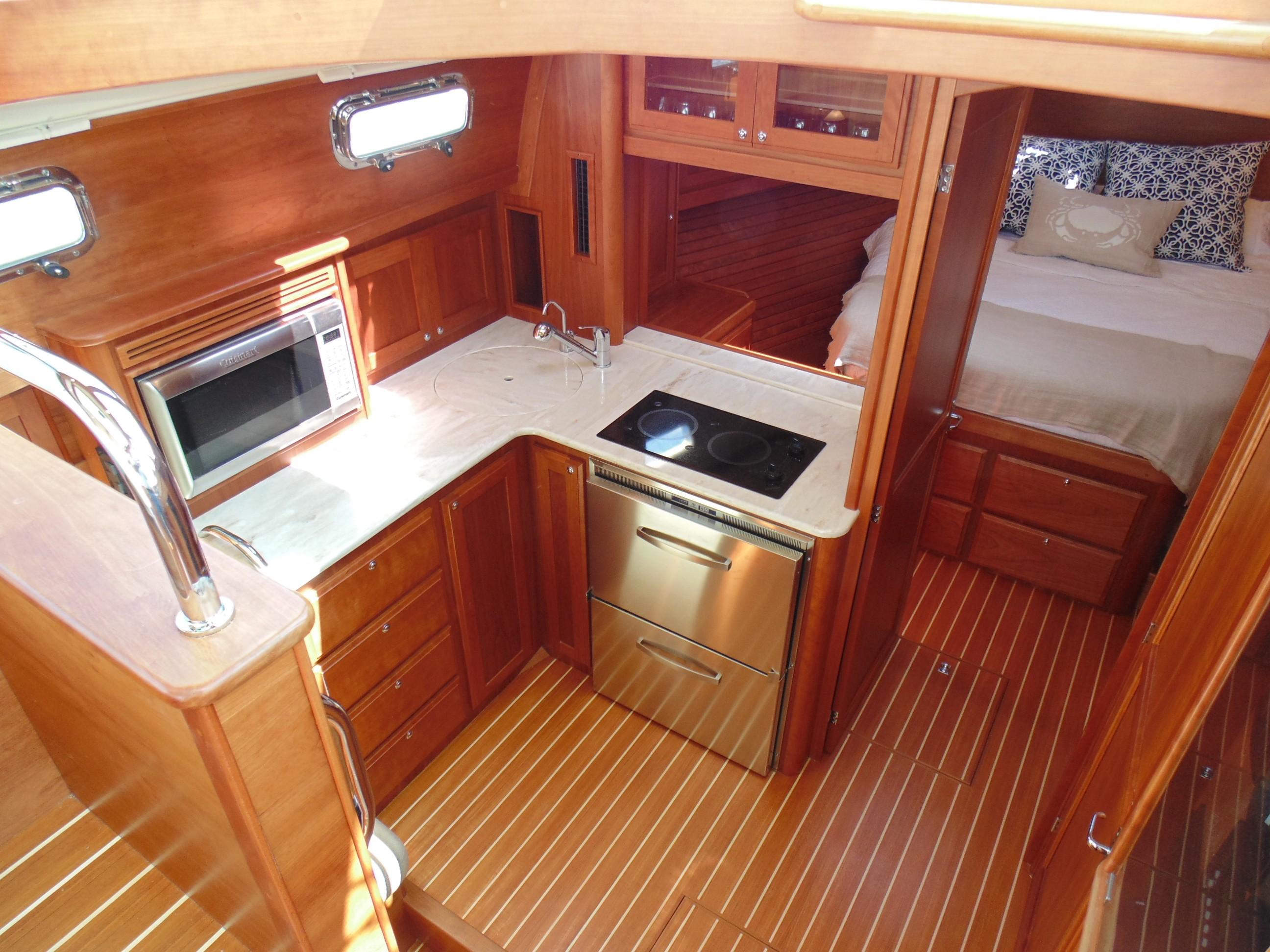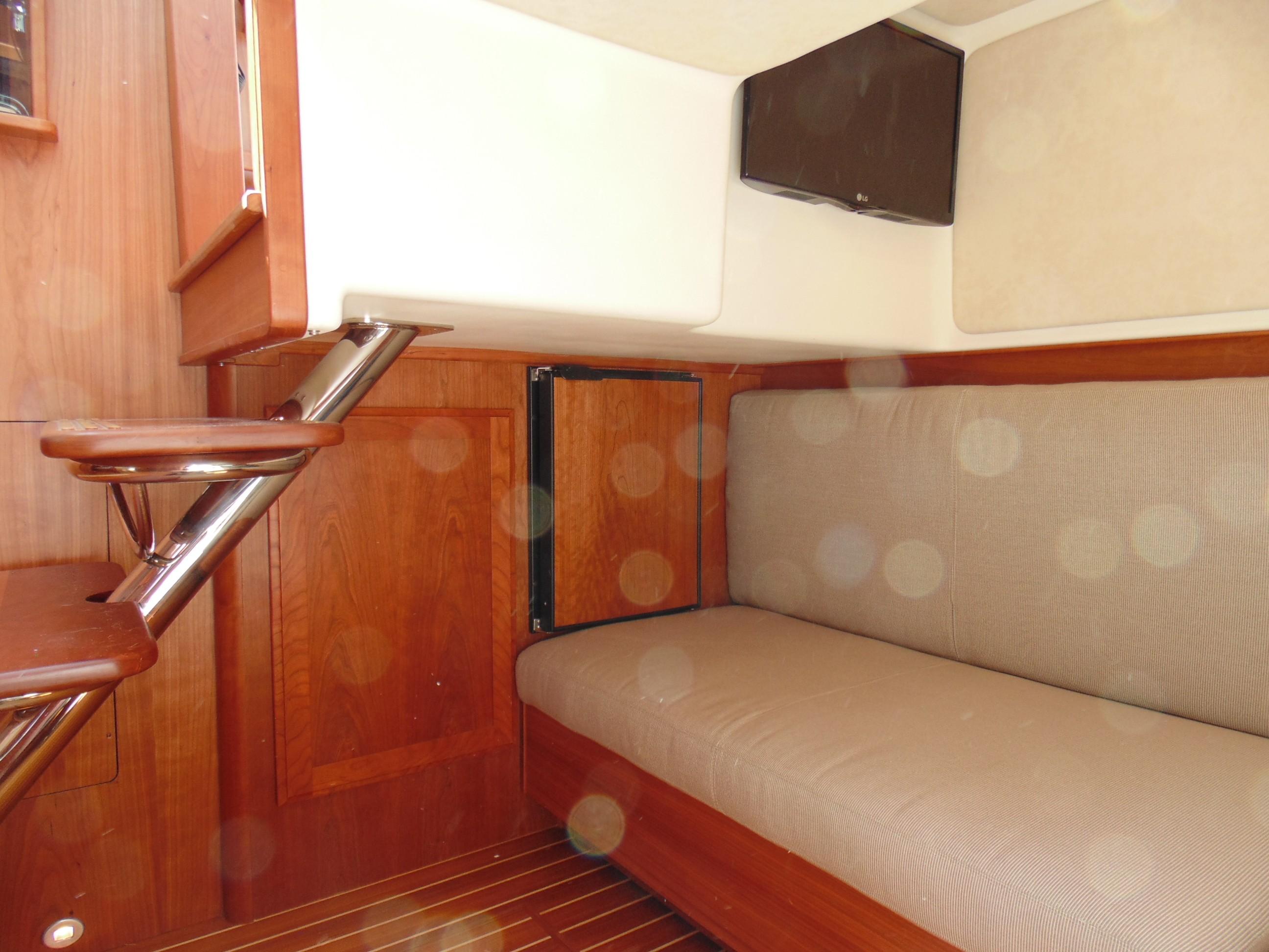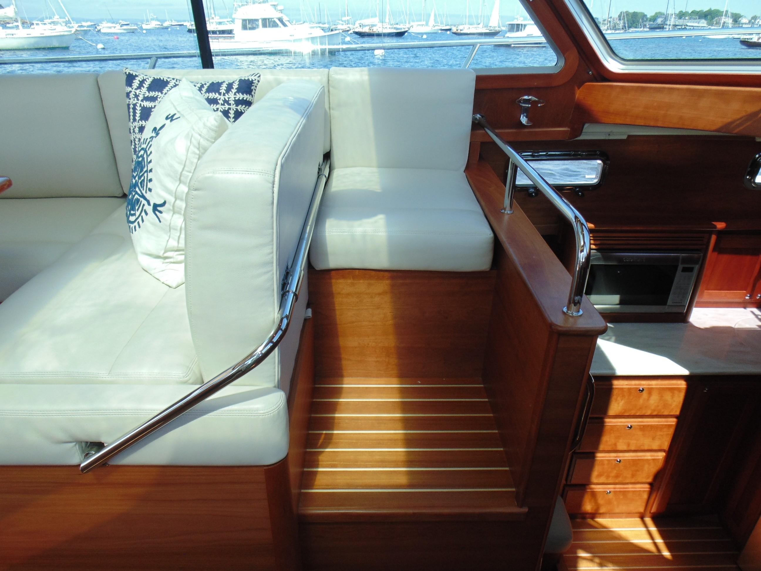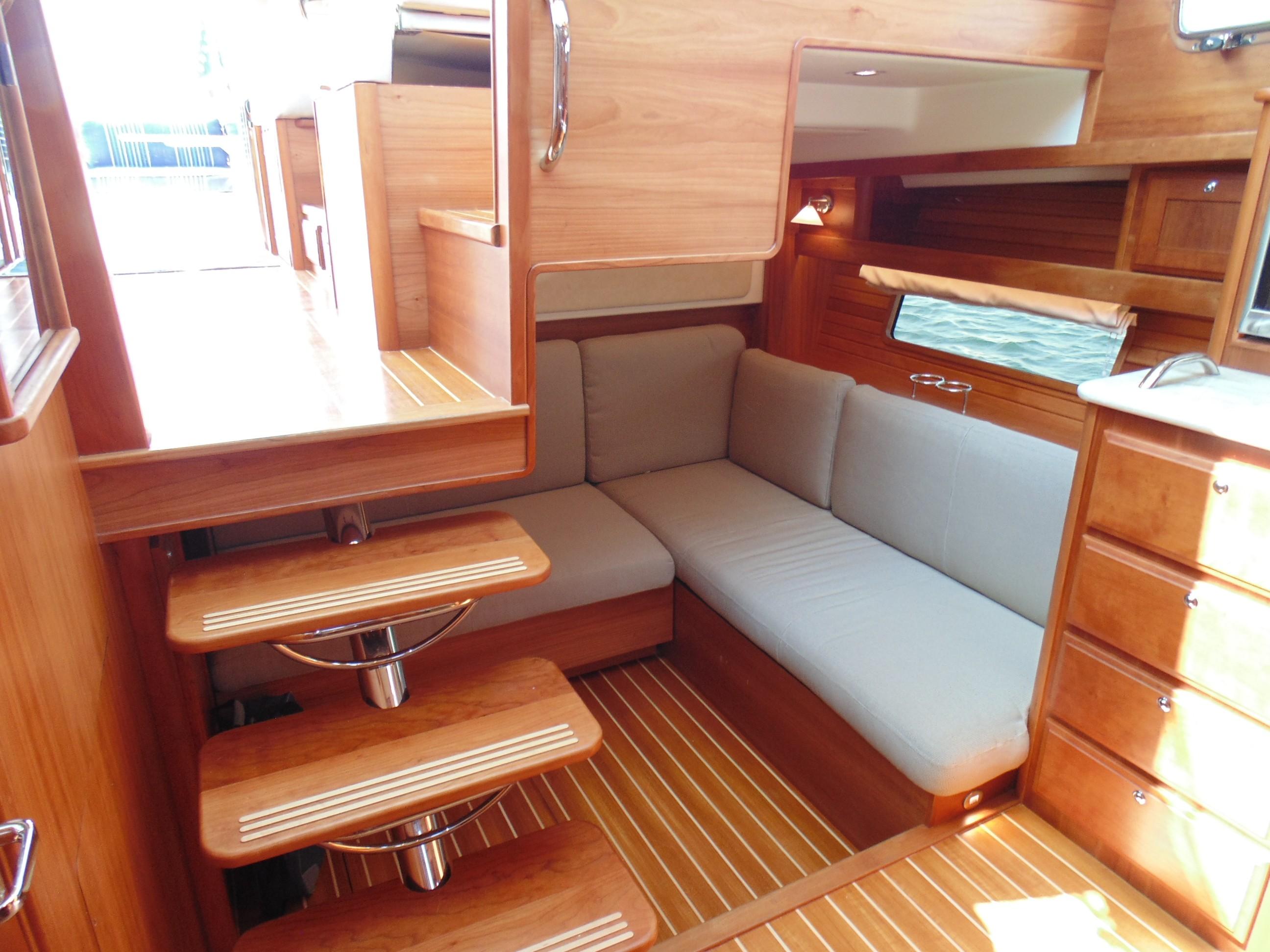 Mates L-shaped settee forward, open to galley with stainless steel hand rail