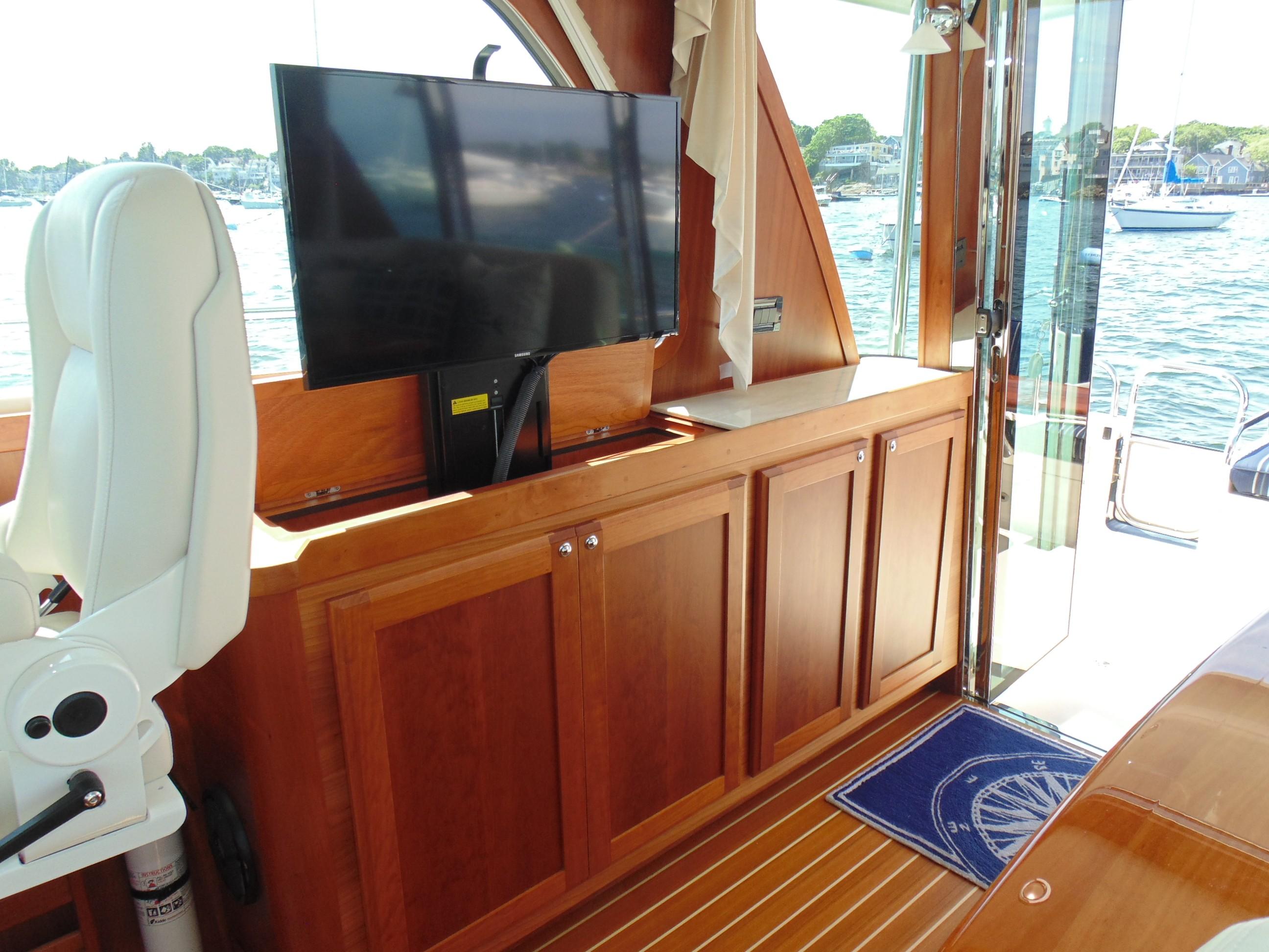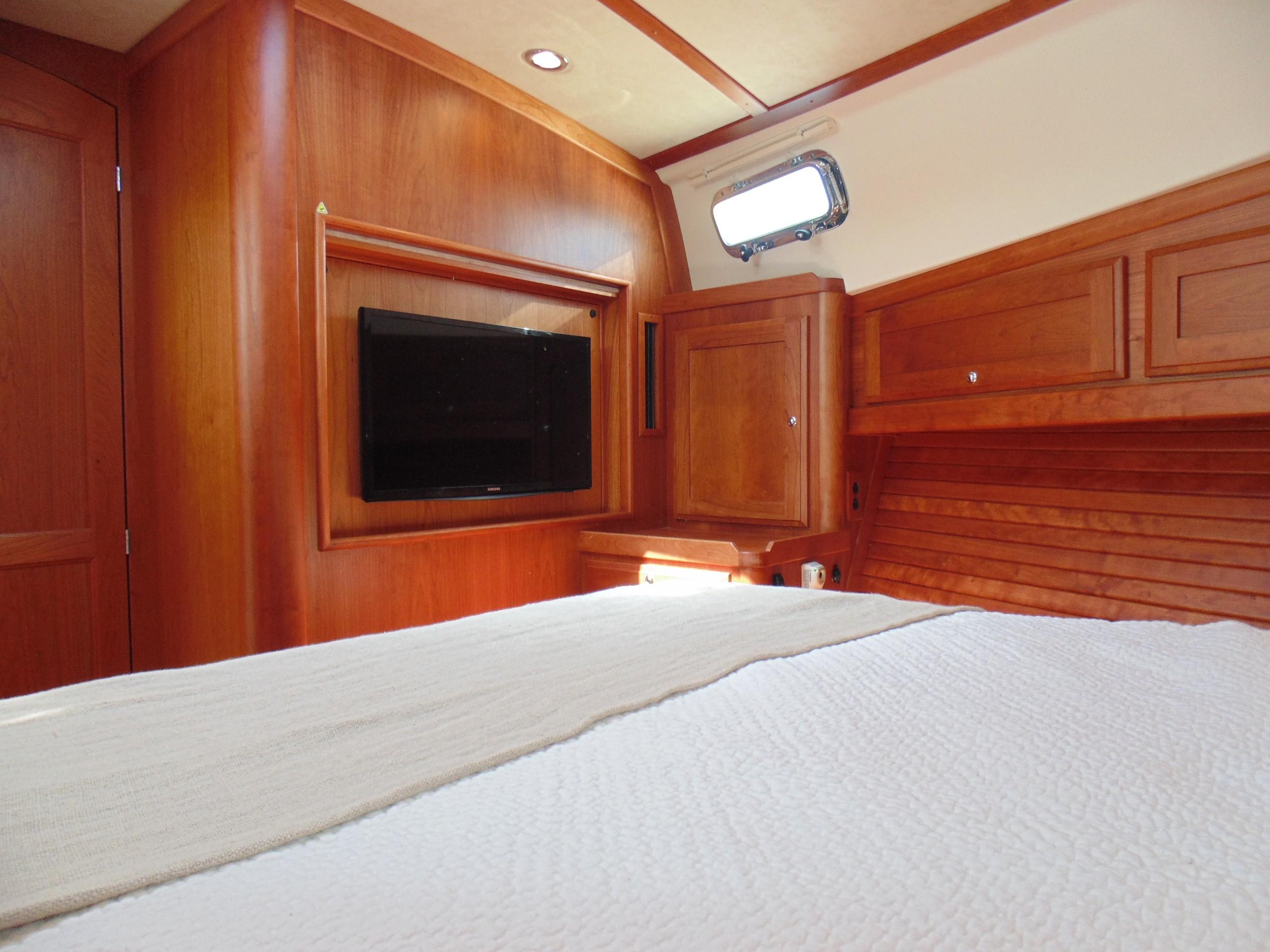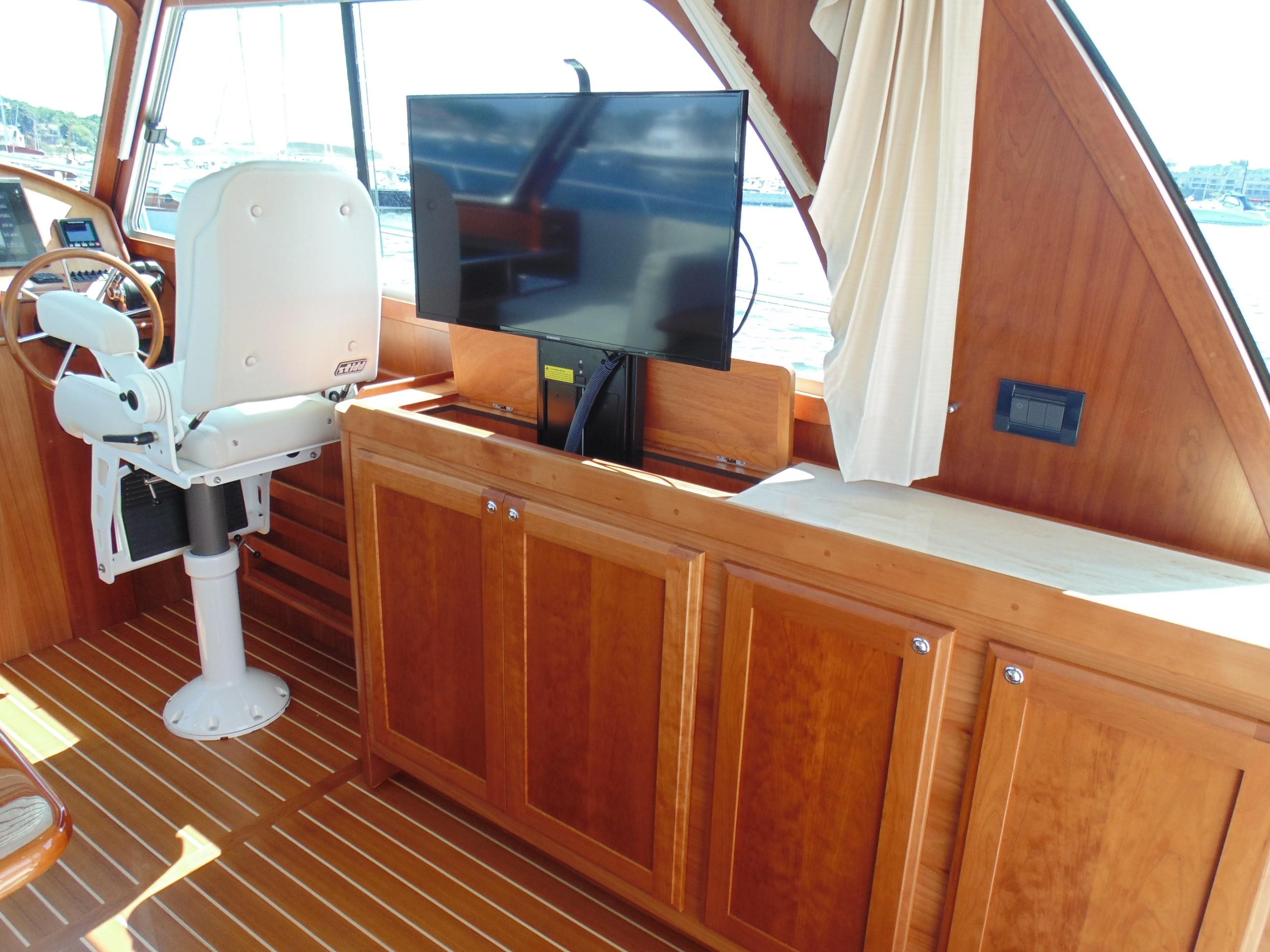 Divider between galley and stateroom with surface mounted TV on electric lift