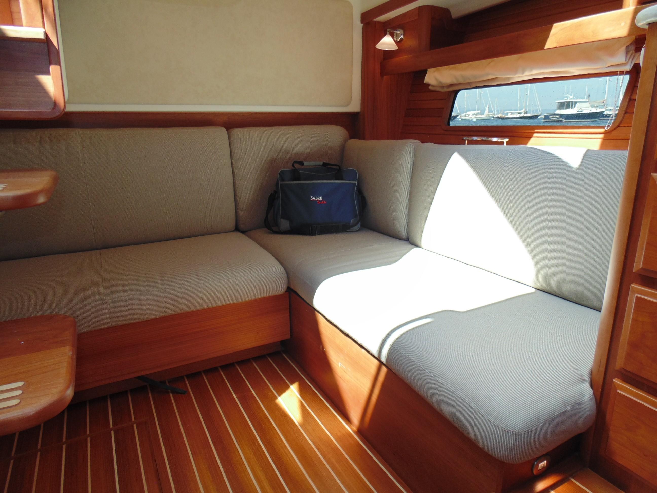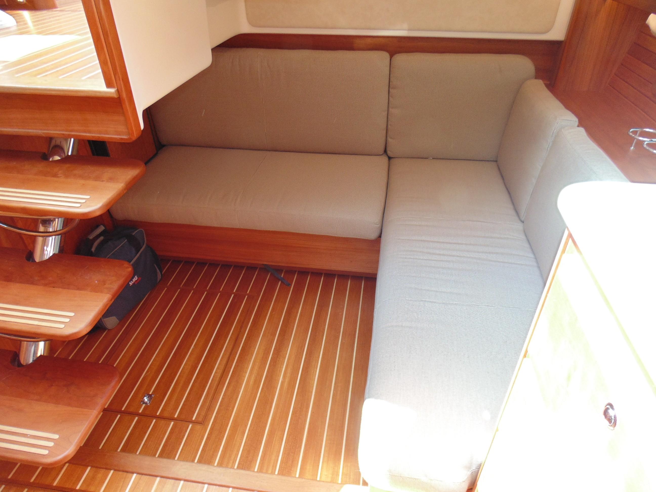 Elevated "U" settee to port with fold over table, converts to double berth with storage underneath