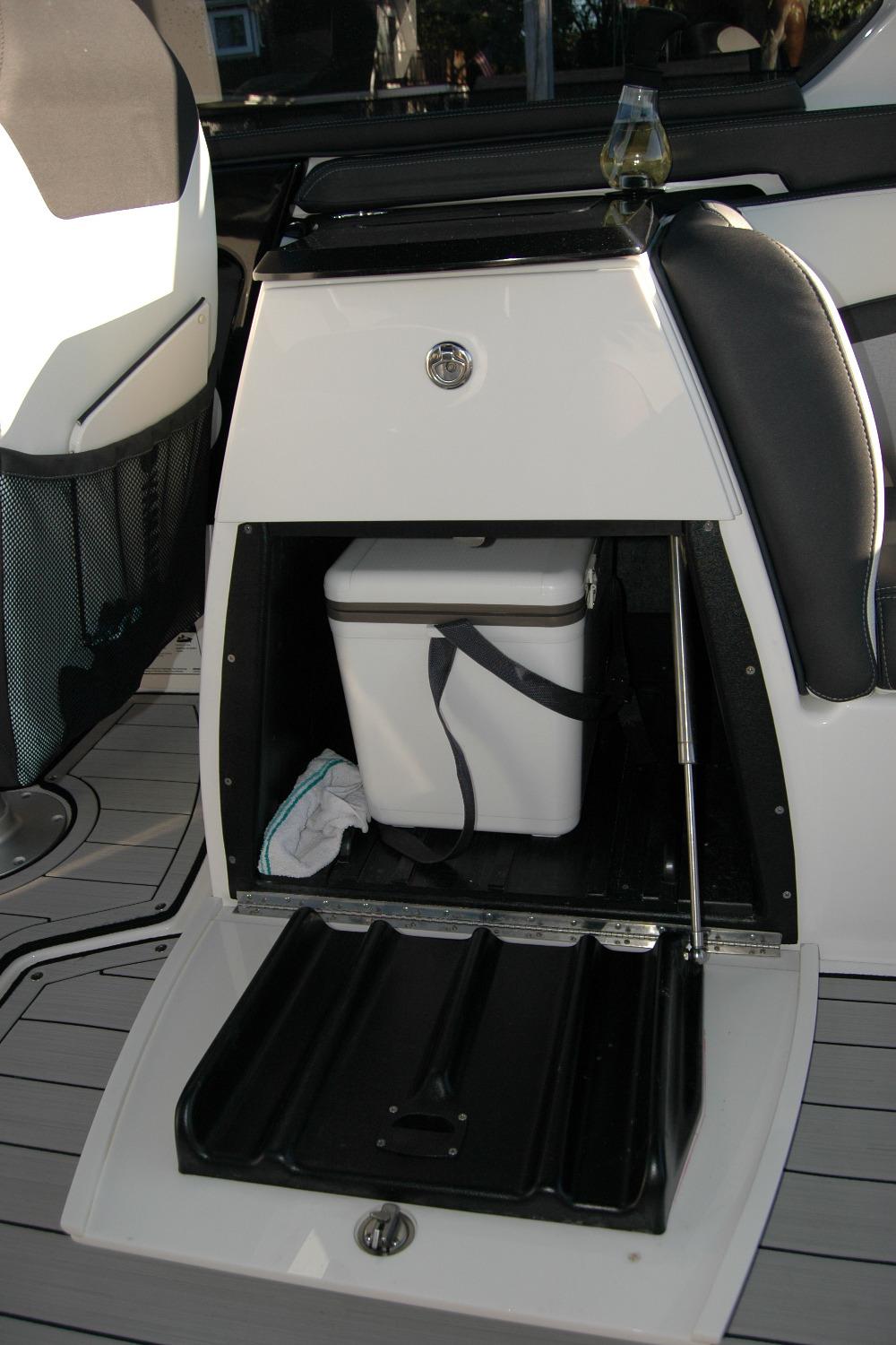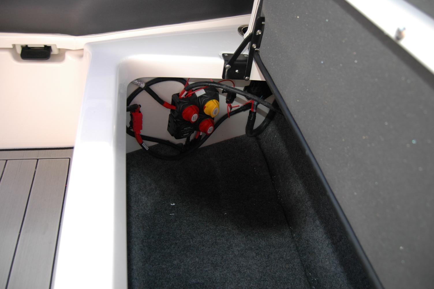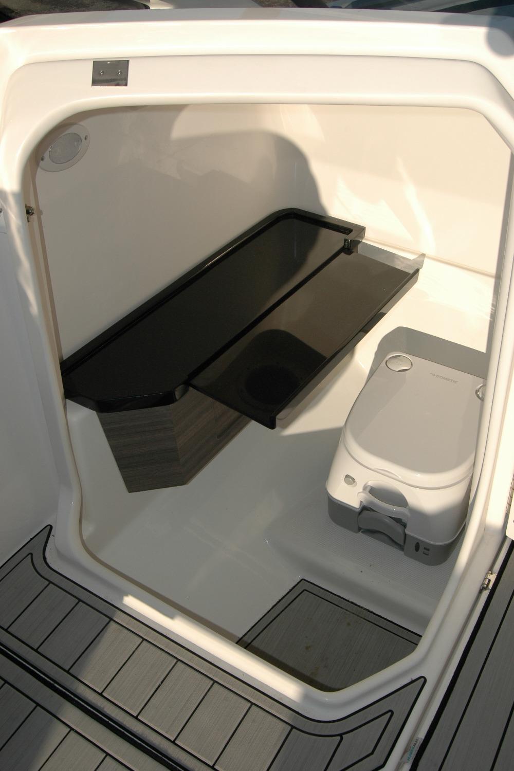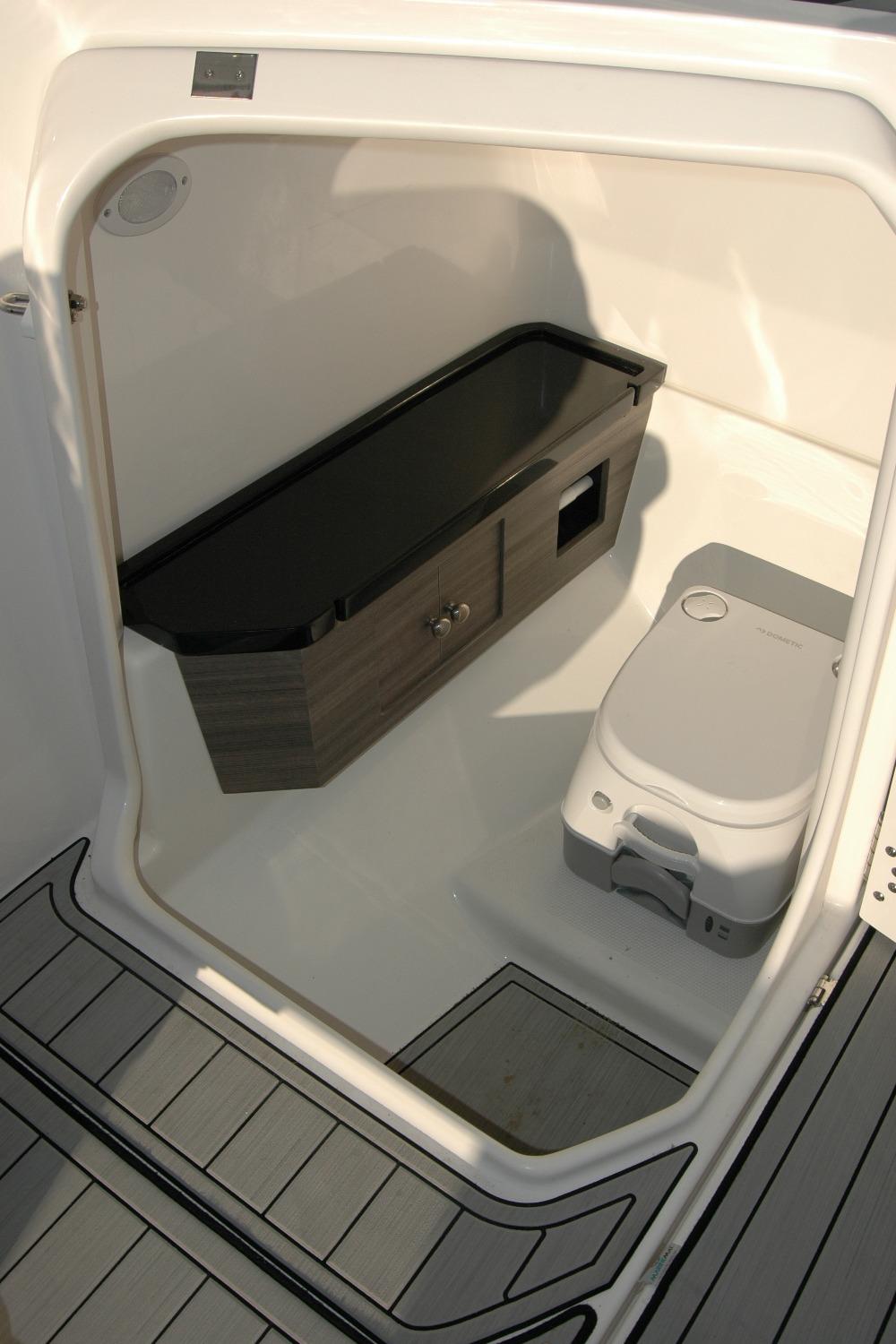 Stepping through the opening windshield brings you aft to the helm on the starboard side, and mate's seat to port. Head compartment with porta-potty is in the compartment in front of the mate's seat. Opposite is the helm which offers comfortable ergonomics, easy reach of controls, and good sight lines. There is a storage compartment in front of the helm area, as well as a long locker under the floor between these two seats.