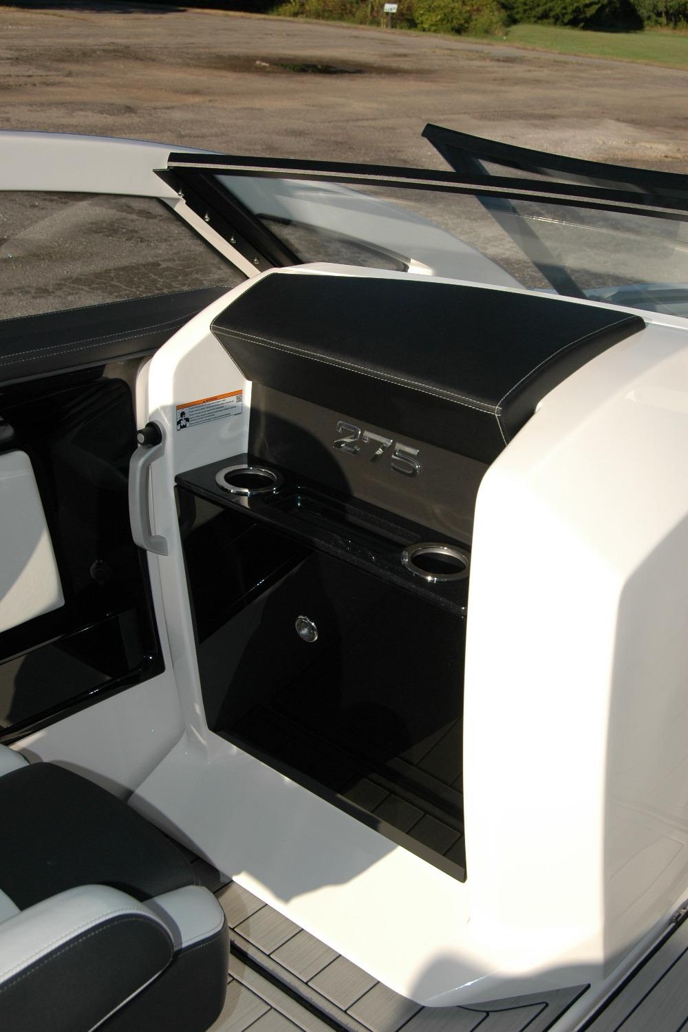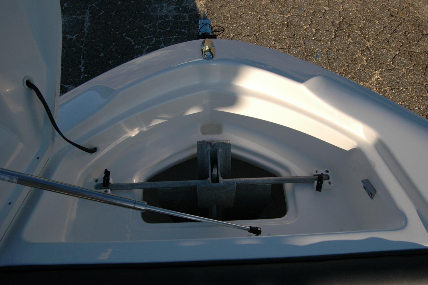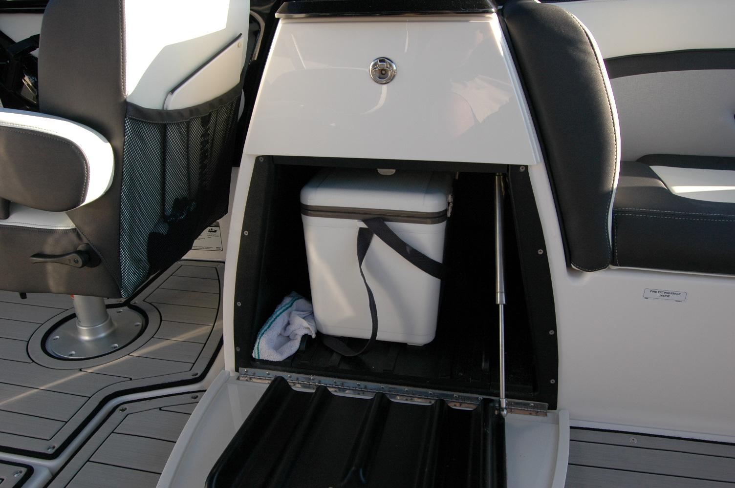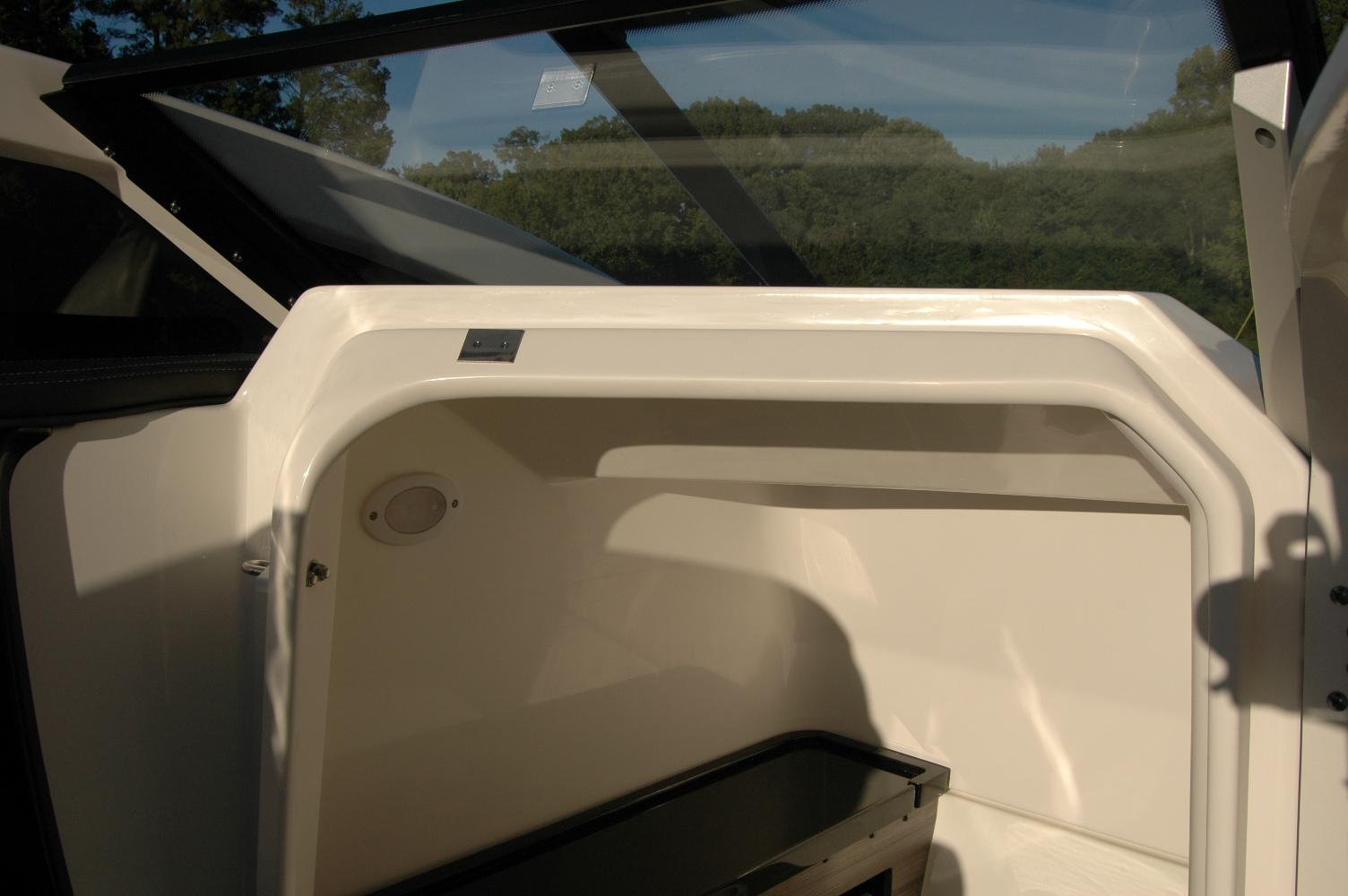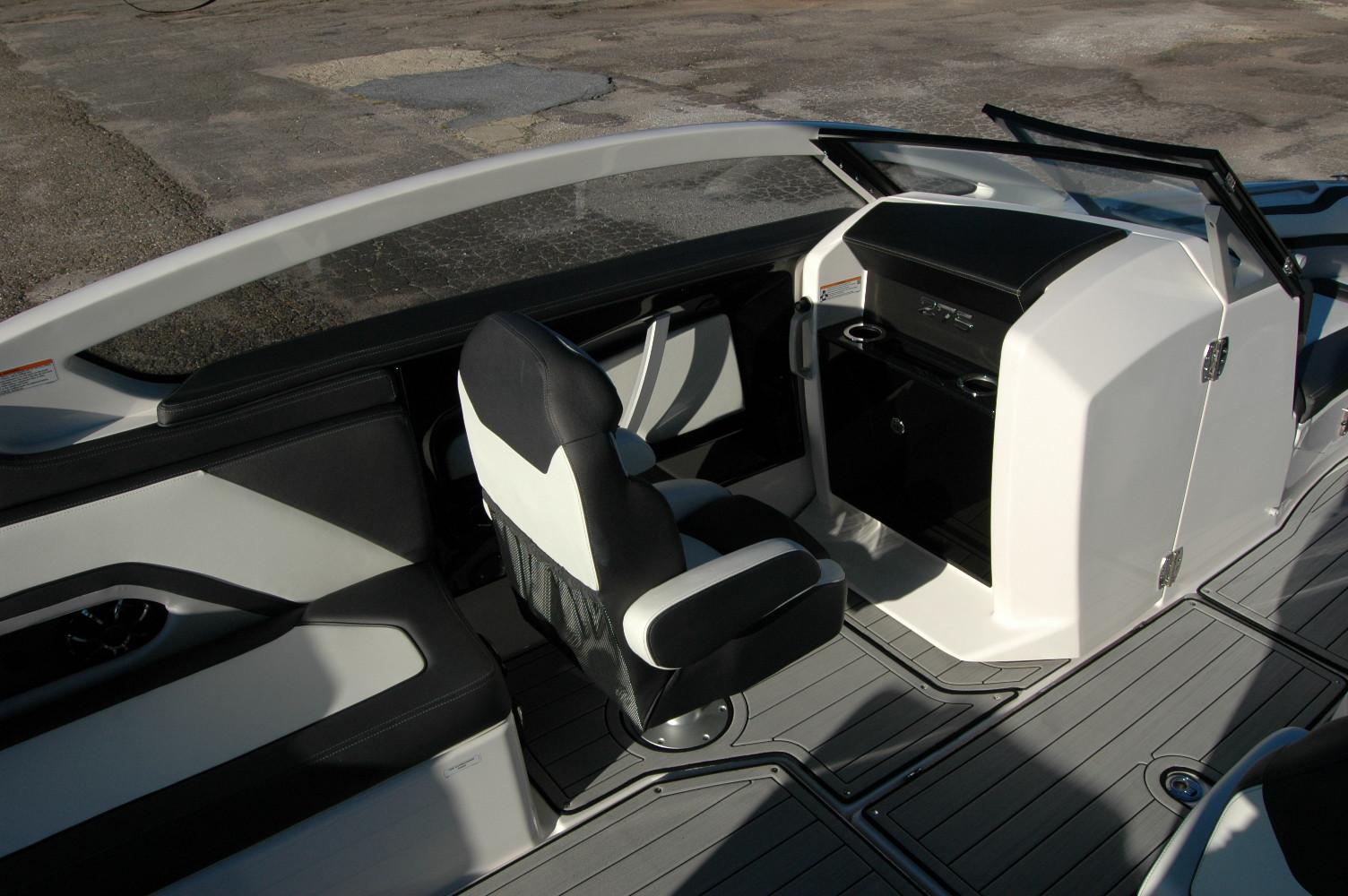 Stepping through the opening windshield brings you aft to the helm on the starboard side, and mate's seat to port. Head compartment with porta-potty is in the compartment in front of the mate's seat. Opposite is the helm which offers comfortable ergonomics, easy reach of controls, and good sight lines. There is a storage compartment in front of the helm area, as well as a long locker under the floor between these two seats.