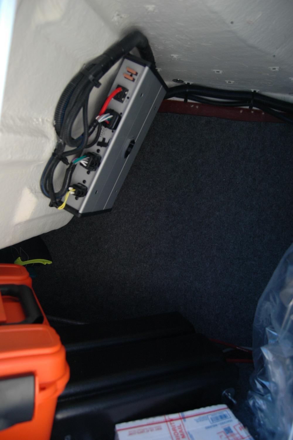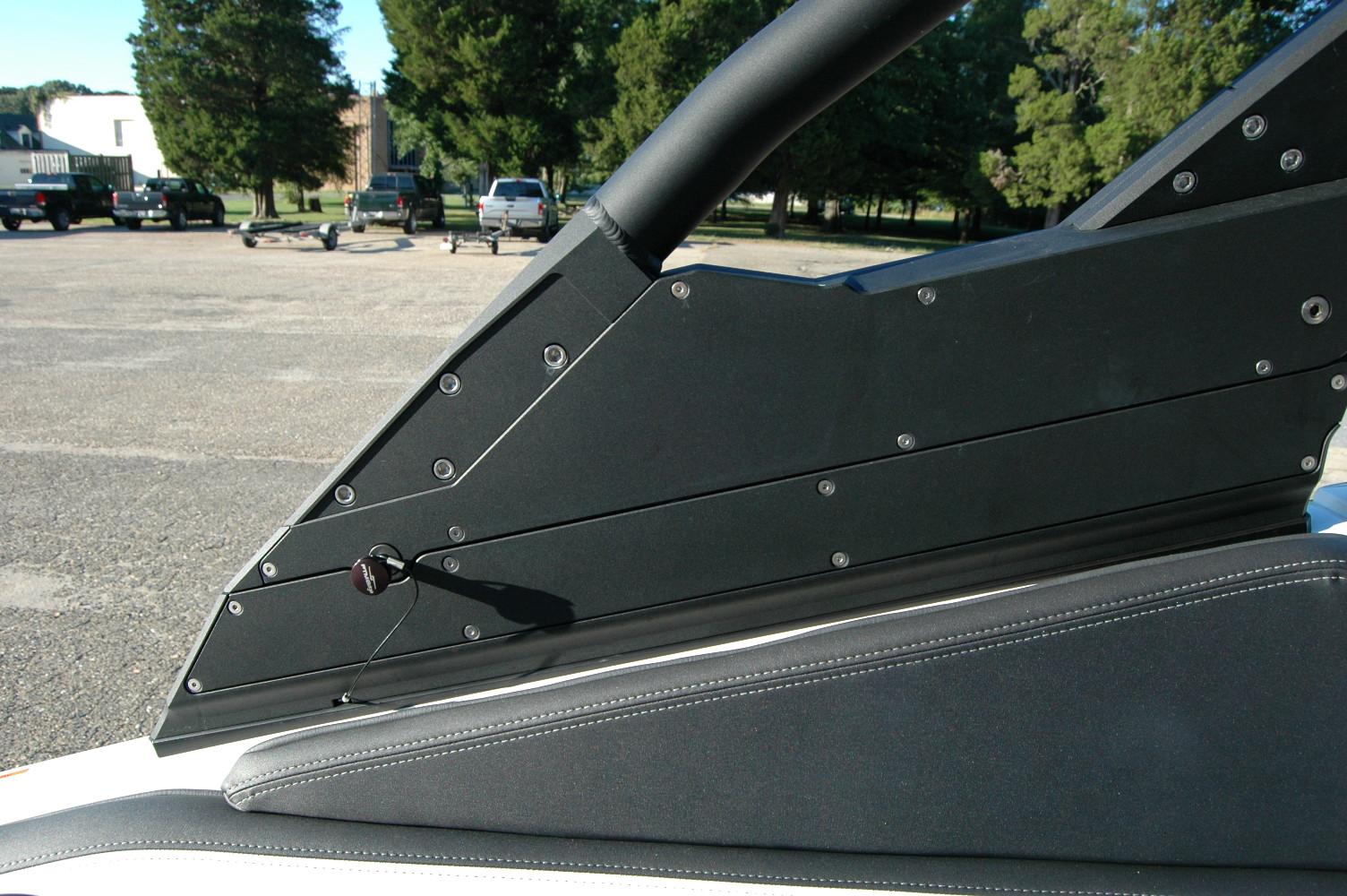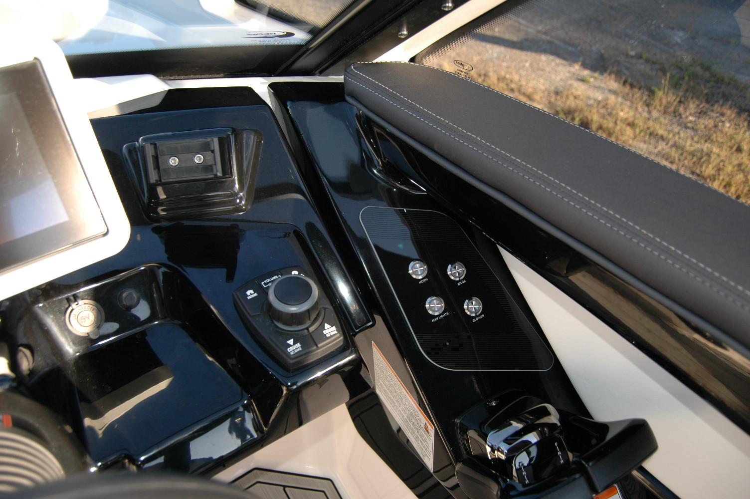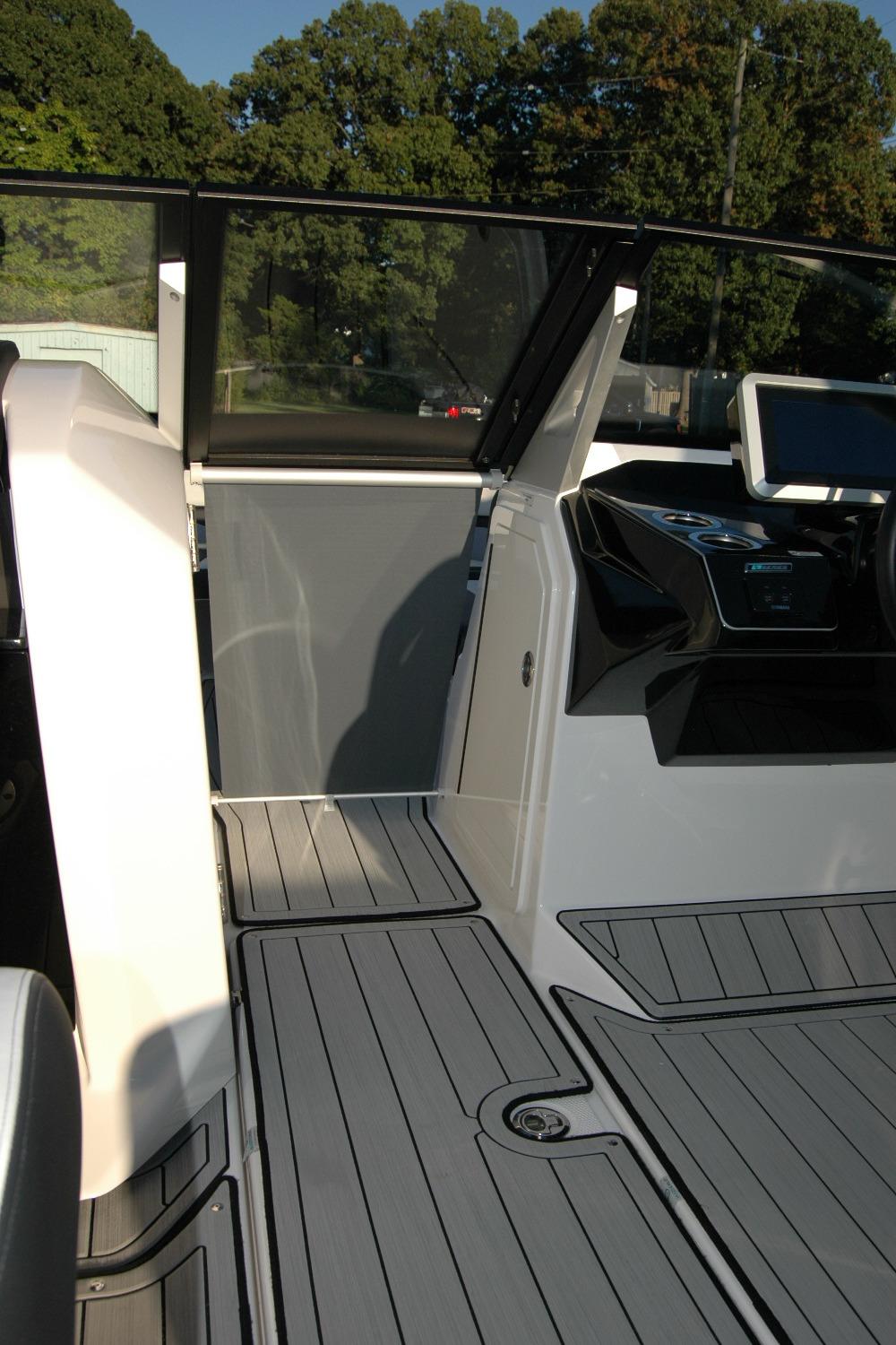Stepping through the opening windshield brings you aft to the helm on the starboard side, and mate's seat to port. Head compartment with porta-potty is in the compartment in front of the mate's seat. Opposite is the helm which offers comfortable ergonomics, easy reach of controls, and good sight lines. There is a storage compartment in front of the helm area, as well as a long locker under the floor between these two seats.