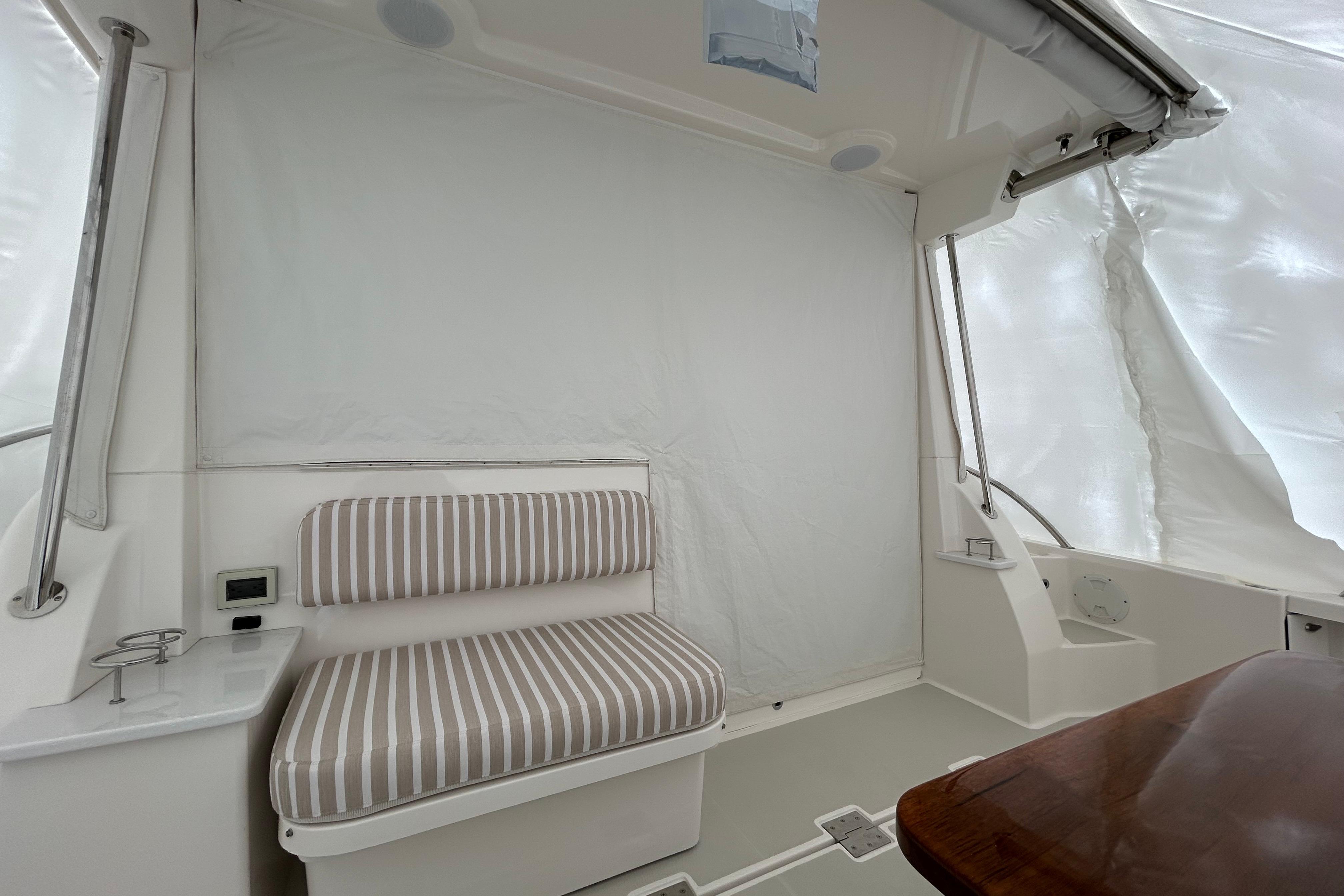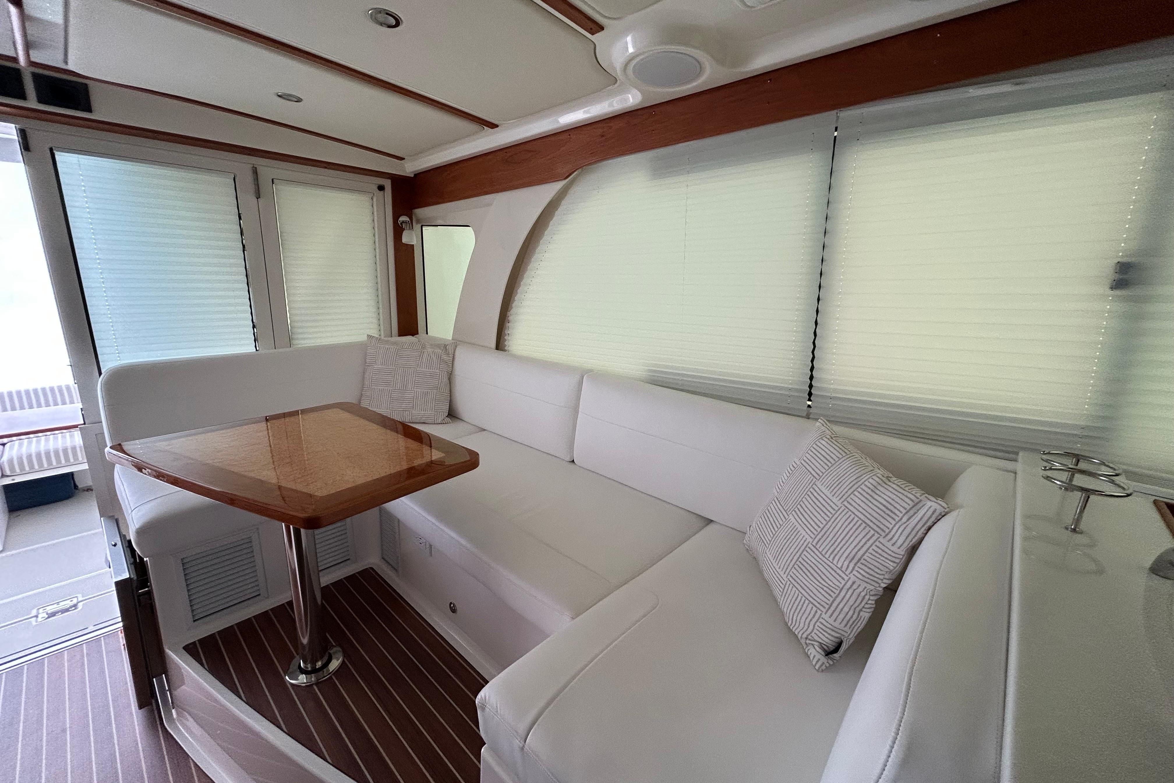 The 39O offers a hard back for a fully enclosed helm deck; a unique design in this segment, which allows for climate-controlled comfort and an extended boating season with optimal protection from the elements. Her indoor social spaces keep everyone connected, featuring a galley up design and side-by-side captain and mate seats opposite a comfortable U-shaped settee. The result is a perfect space where the crew can enjoy a meal, or lounge while staying out of the sun or the rain.