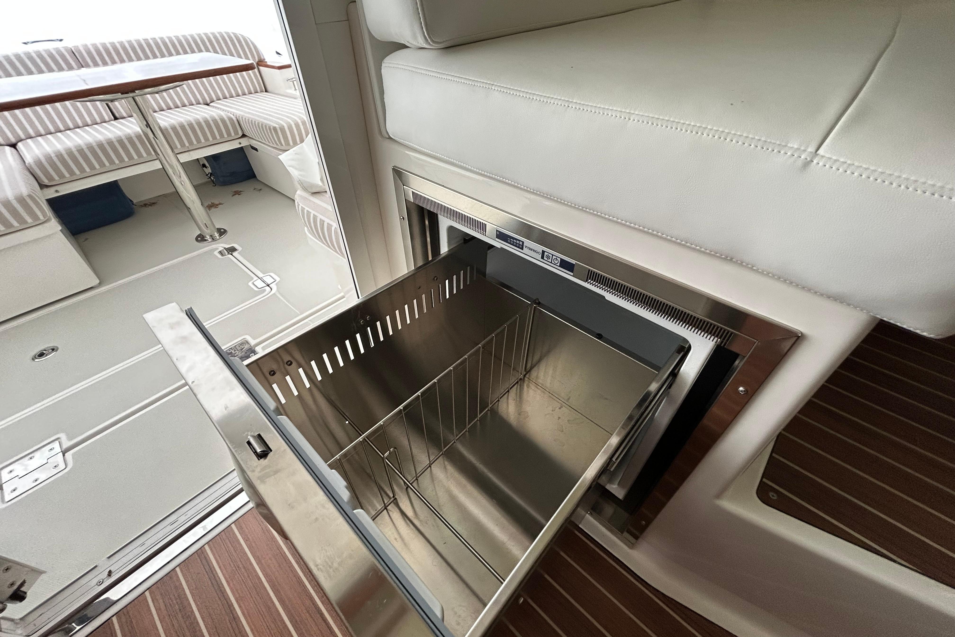 The Back Cove 39O is the fastest and quietest Back Cove model yet. Her cockpit is a fun and relaxing space with transom gates to port and starboard, a U-shaped settee across from an aft-facing seat, and a central table for al fresco dining and entertaining. Expansive storage below the cockpit is easily accessed through a large actuated hatch, and provides generous accommodations for all of your water toys and gear.